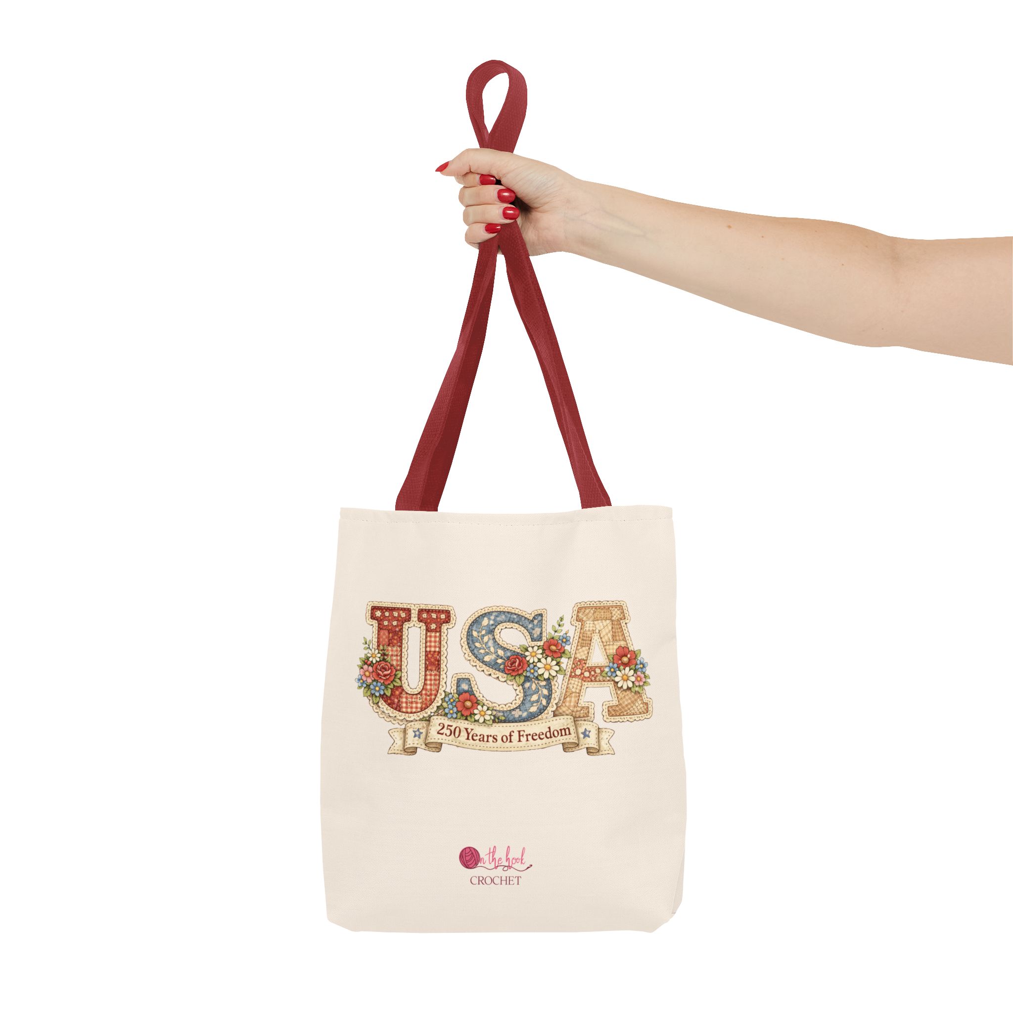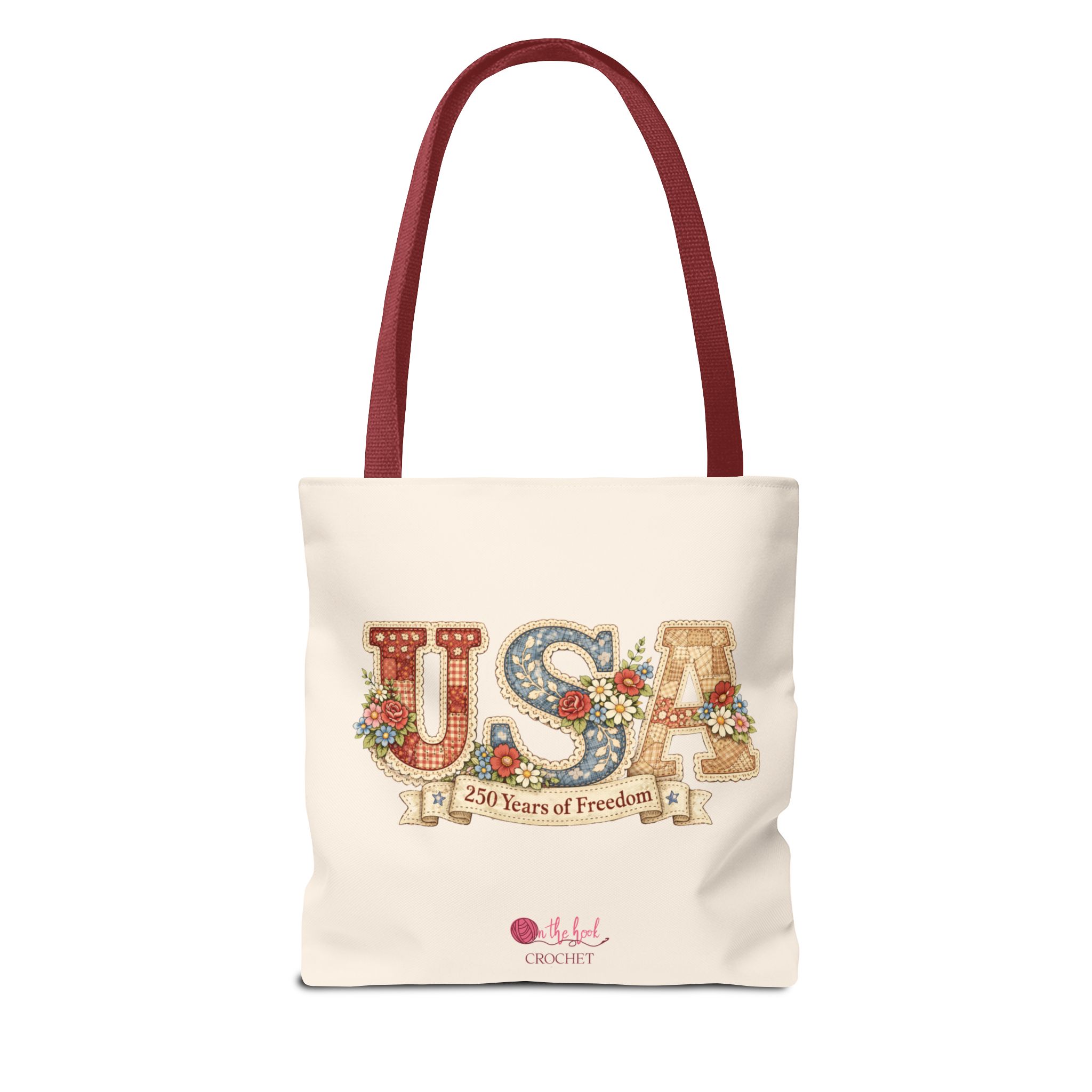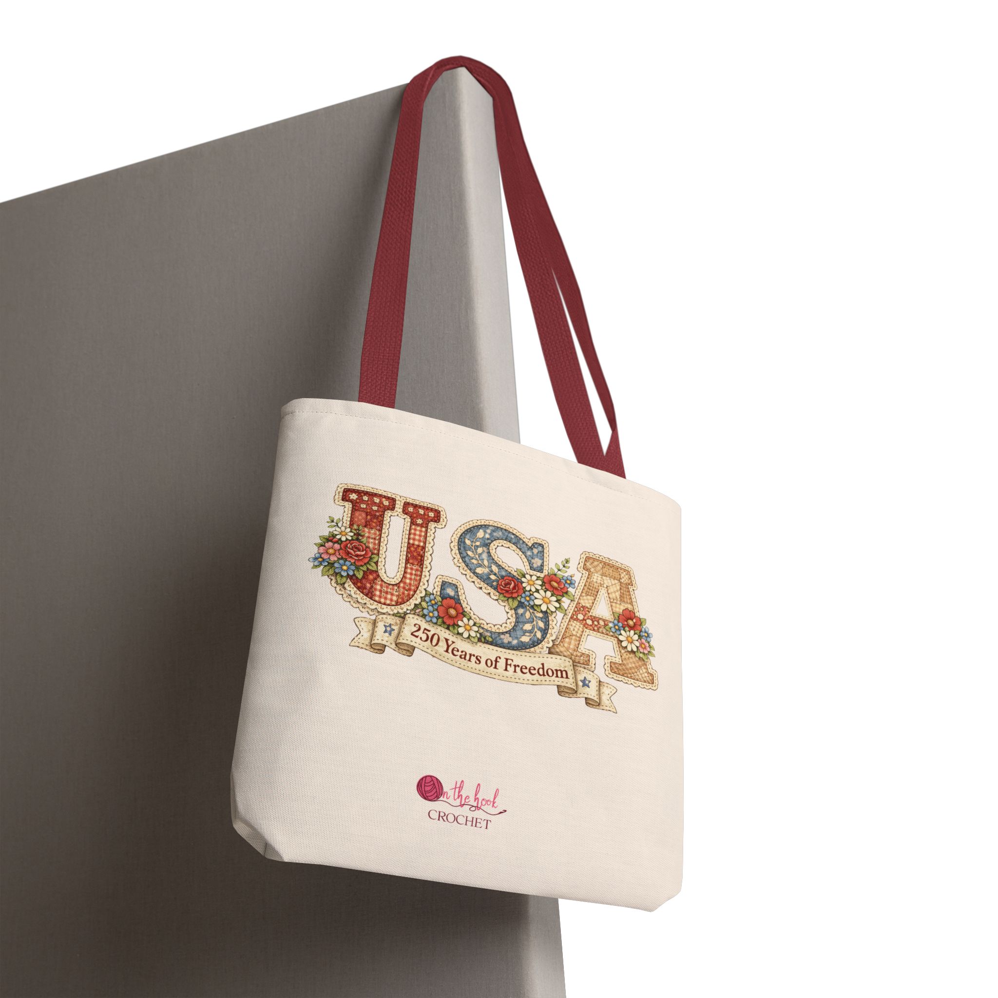 Introducing the America 250 project tote bag from On The Hook Crochet. This tote is designed with original art from an Etsy artist. It is lovely to look at and has a patriotic look. The 13″ size is perfect for one project. Made with polyester canvas, this bag has double-stitched seams, cotton webbing straps, and nonwoven laminate lining for easy use and durability.