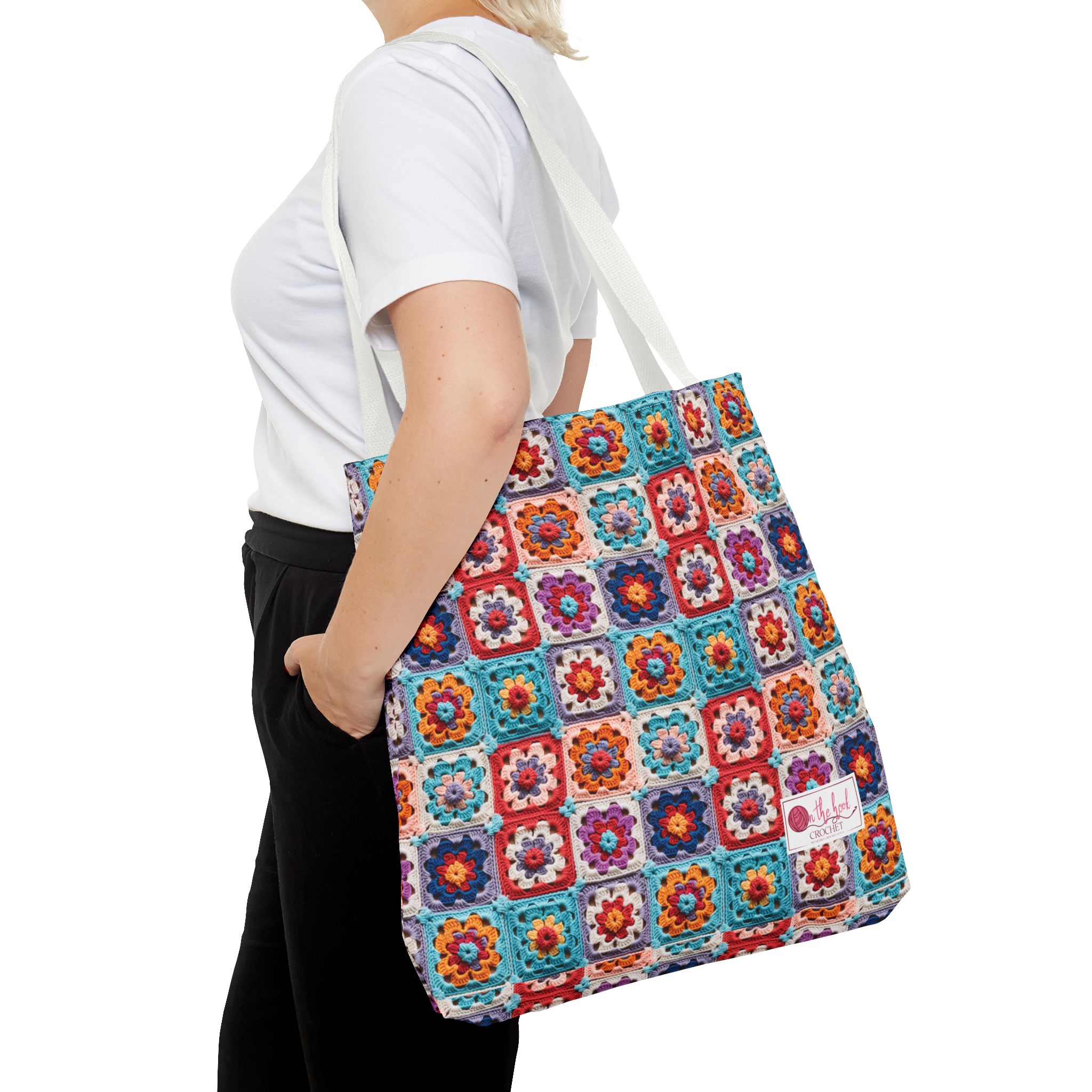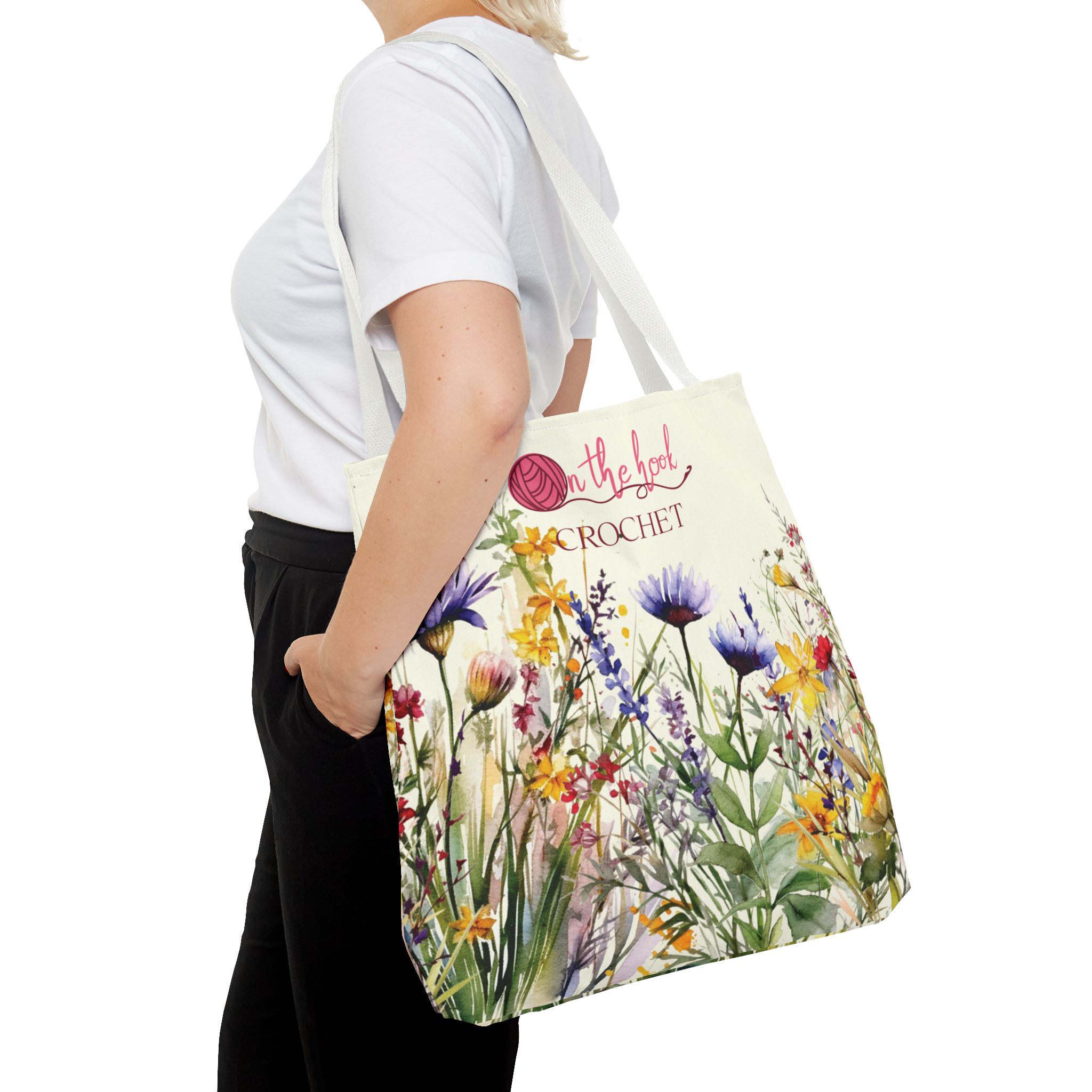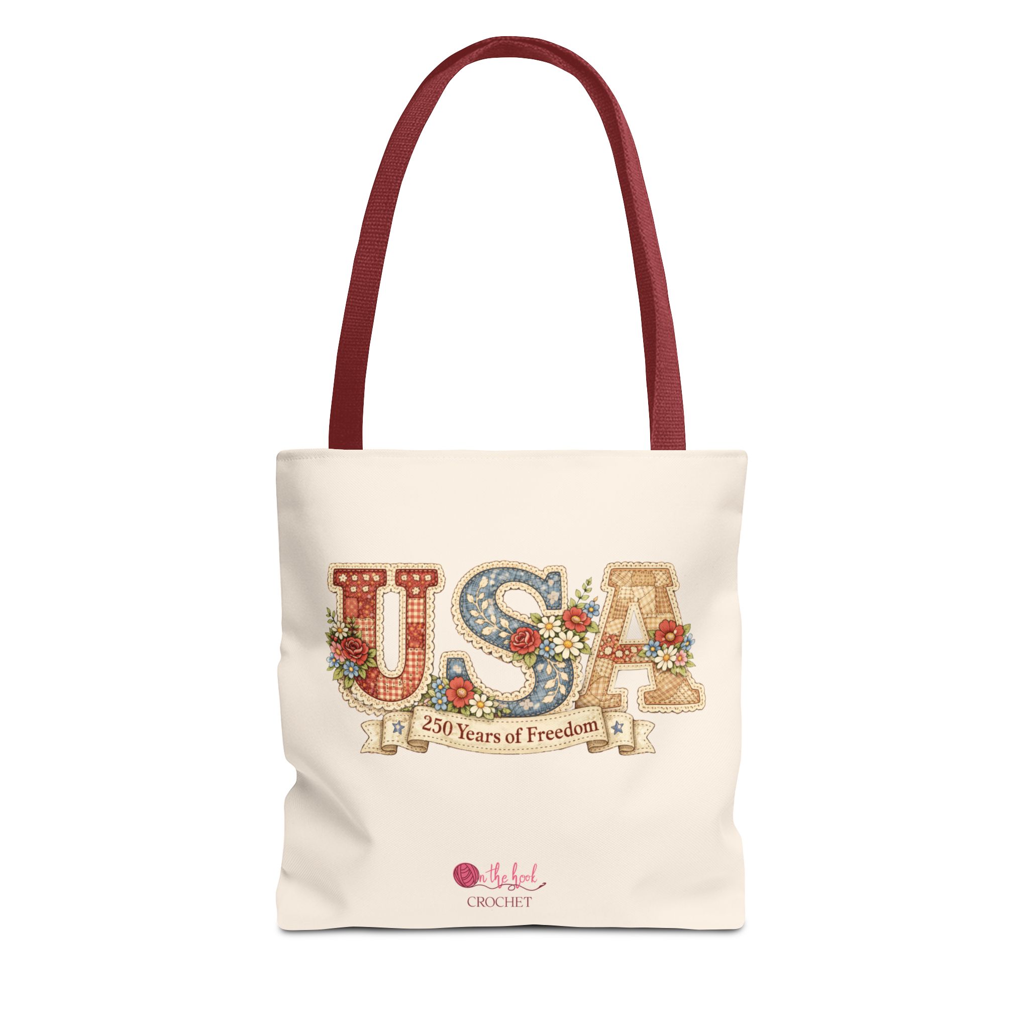 Introducing the America 250 project tote bag from On The Hook Crochet. This tote is designed with original art from an Etsy artist. It is lovely to look at and has a patriotic look. The 13″ size is perfect for one project. Made with polyester canvas, this bag has double-stitched seams, cotton webbing straps, and nonwoven laminate lining for easy use and durability.