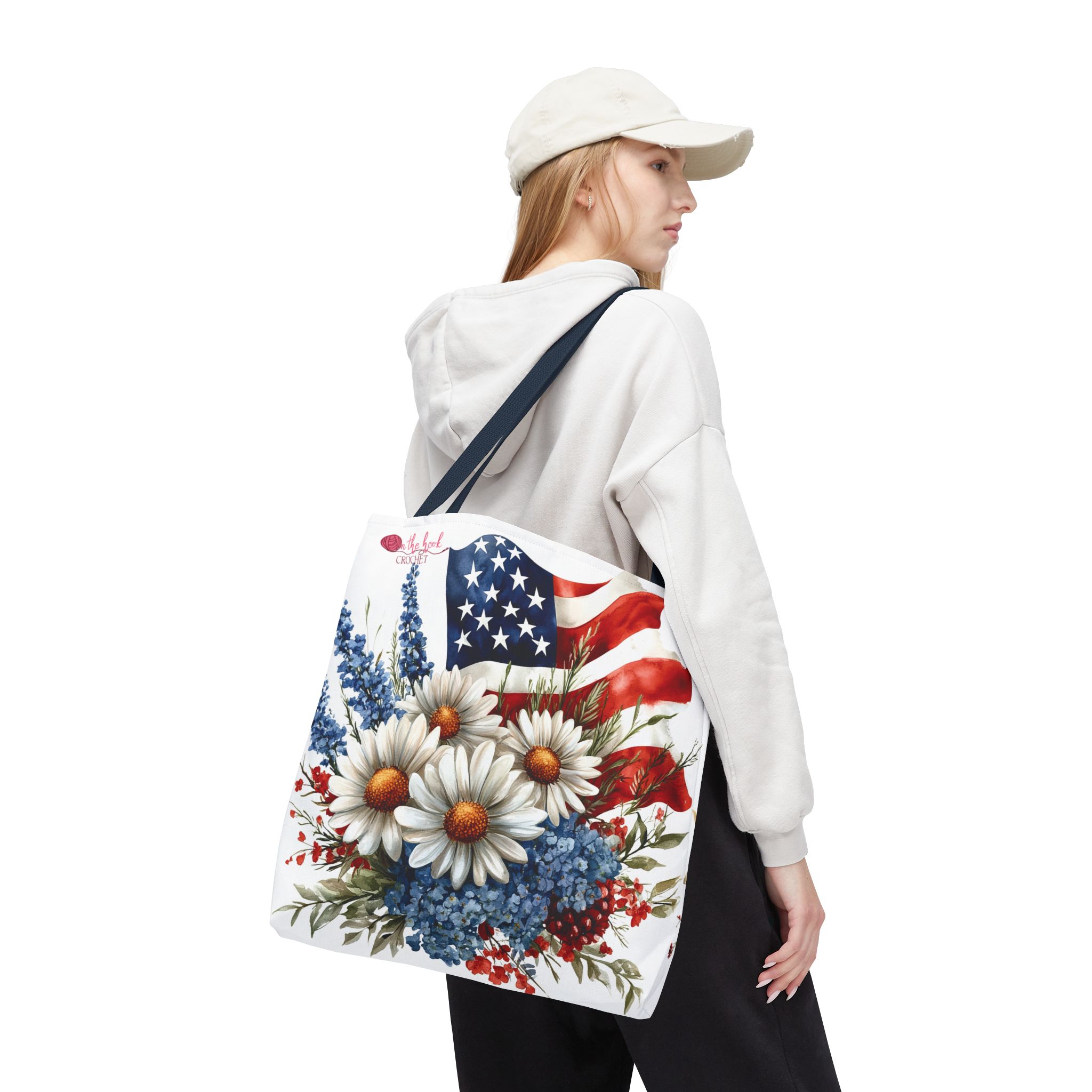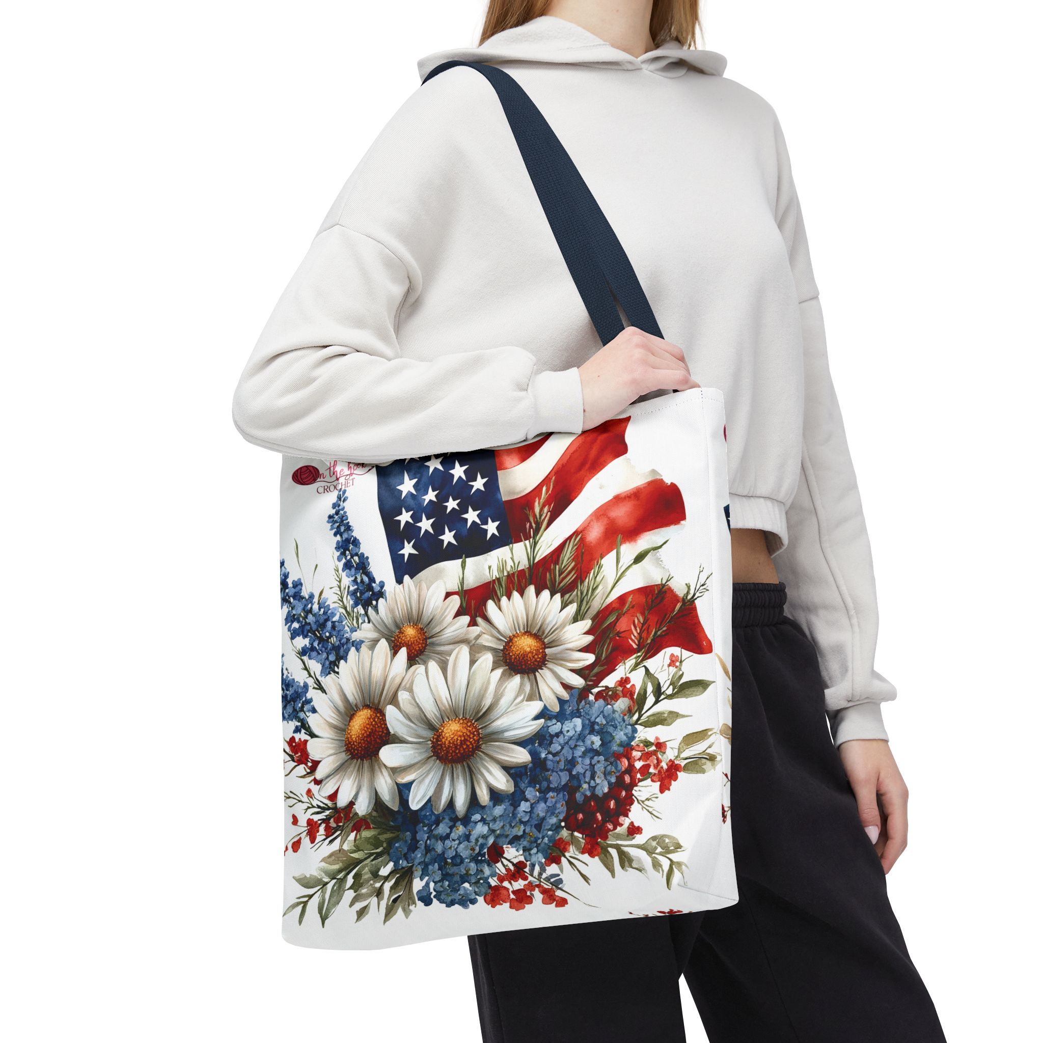 This patriotic-themed crochet and knitting project bag featuring the American flag and flowers is perfect for any crafter who loves to show their patriotic spirit. The larger size of 18″ x 18″ provides ample space for all your crochet and knitting projects. Ideal for crafters who enjoy working on projects with a patriotic theme, such as Memorial Day, Independence Day, or Veterans Day.