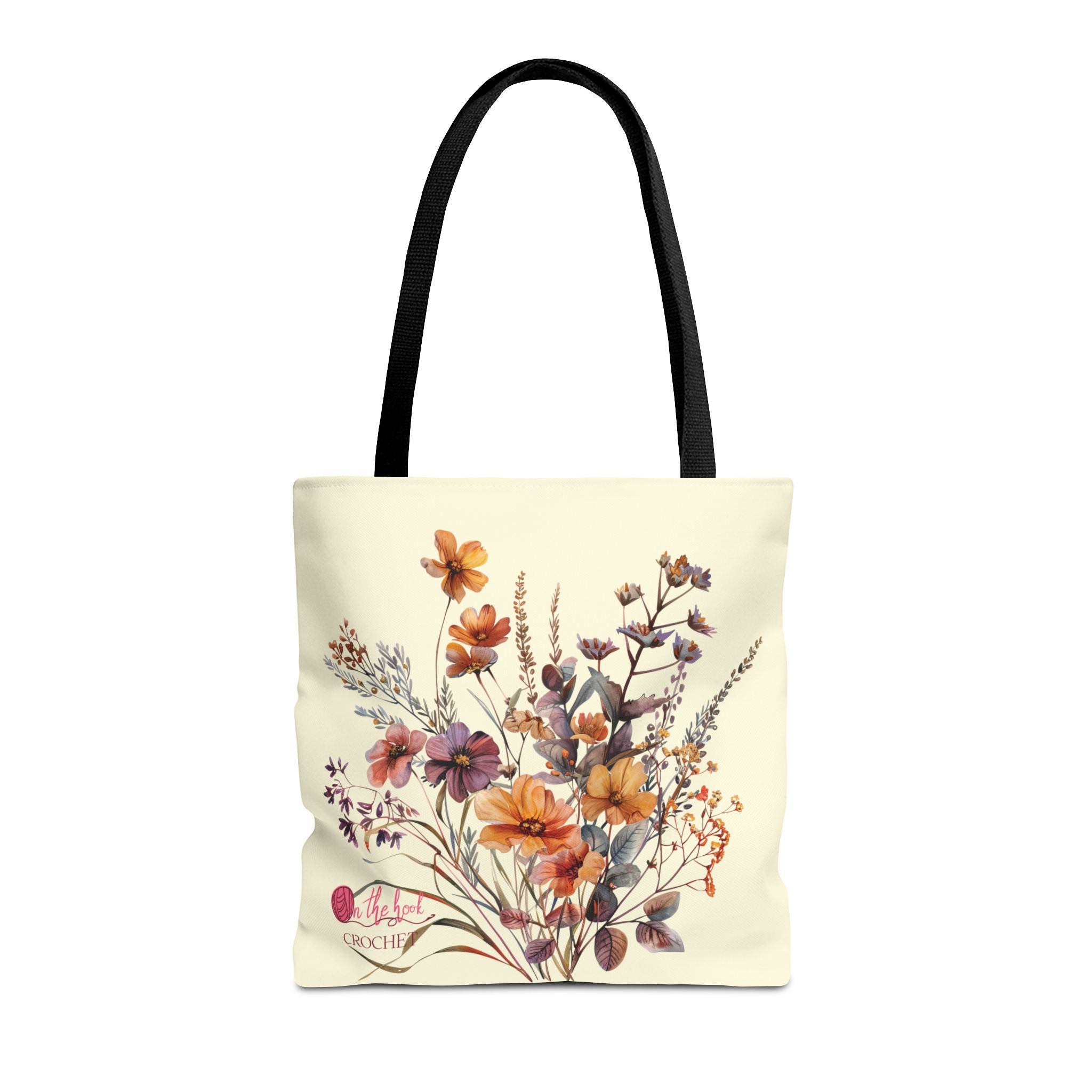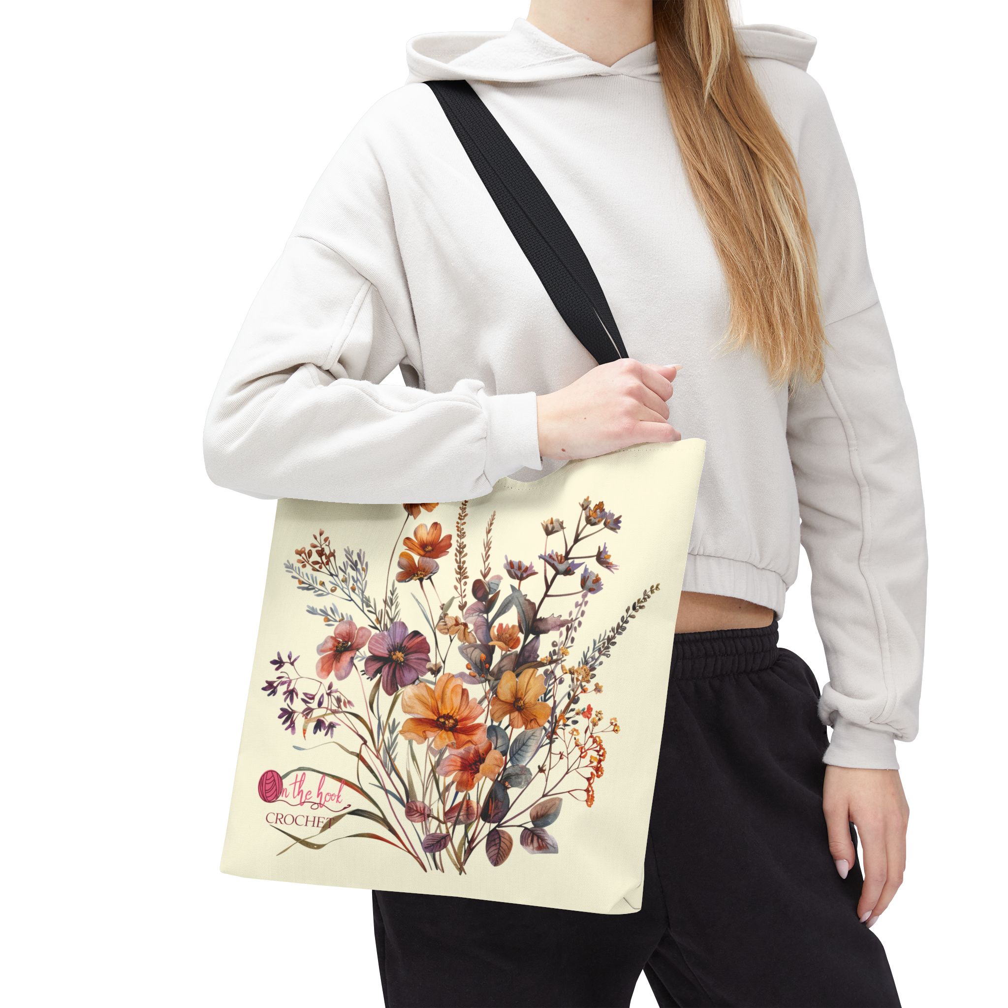 Colorful Autumn Flowers Project Tote – 16″ x 16″. This tote bag is perfect for carrying around your crochet or knitting project. It gives off a cozy and creative vibe, perfect for crafting enthusiasts. This one-of-a-kind tote is customized with the On The Hook logo and original Granny Square art.