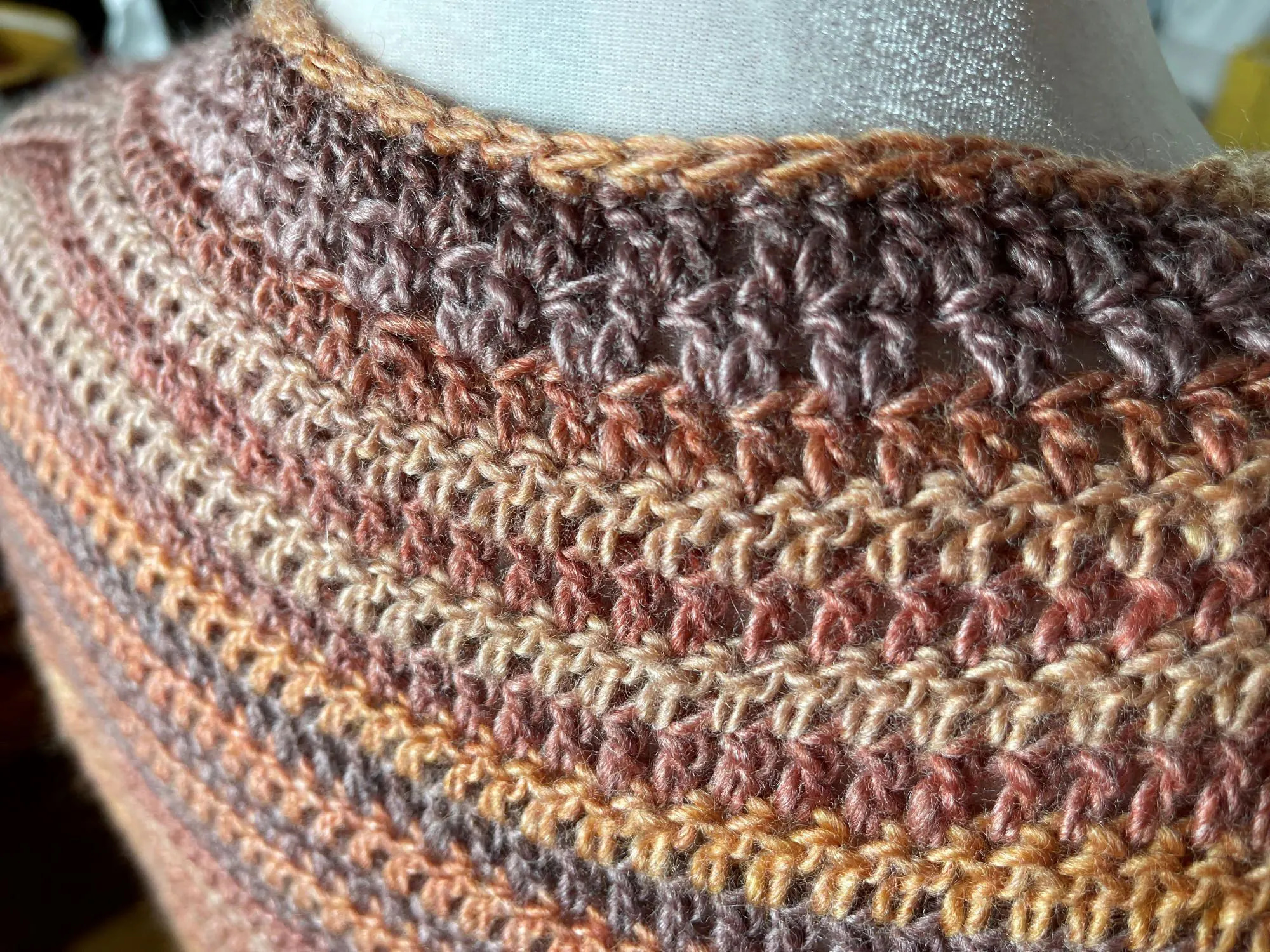 using a heavier yarn in a decorative stitch, pulls in the neckline opening for a warmer