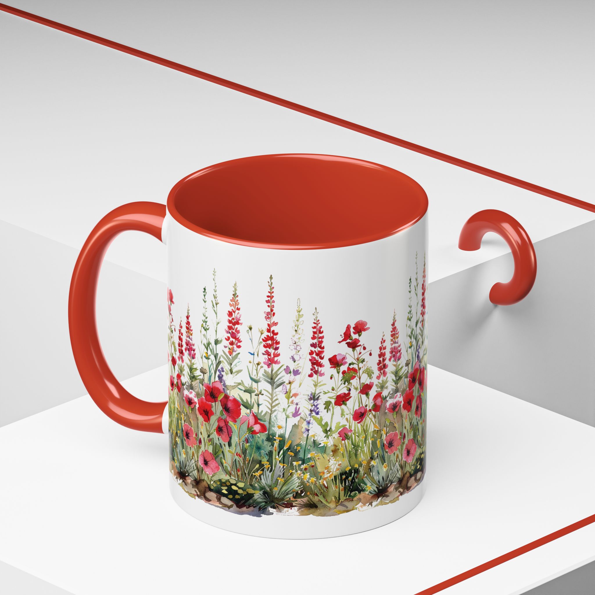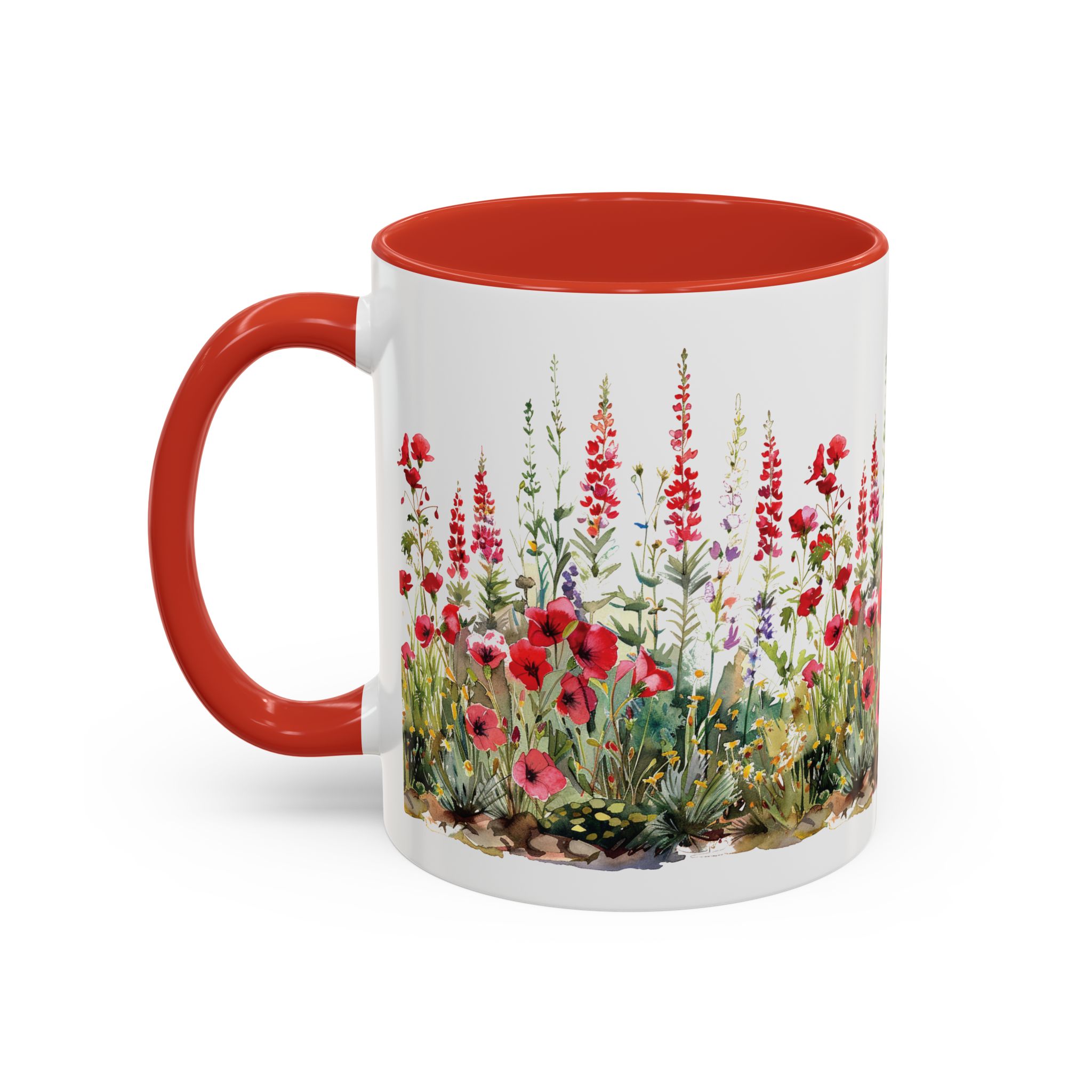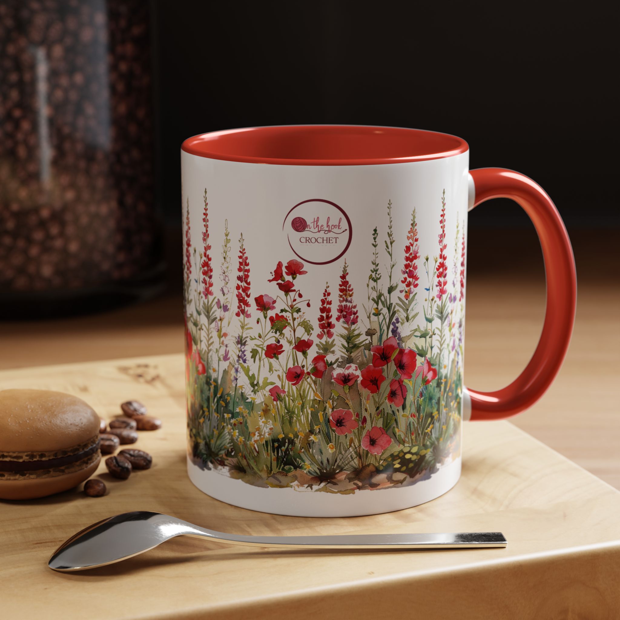 Add some Cardinal Red accents to your crochet time with this pretty wildflower mug by On the Hook Crochet. Designed with original red wildflowers art. Includes a custom version of our logo plus a cheerfully red C-Handle that is comfortable to hold with a matching red interior.