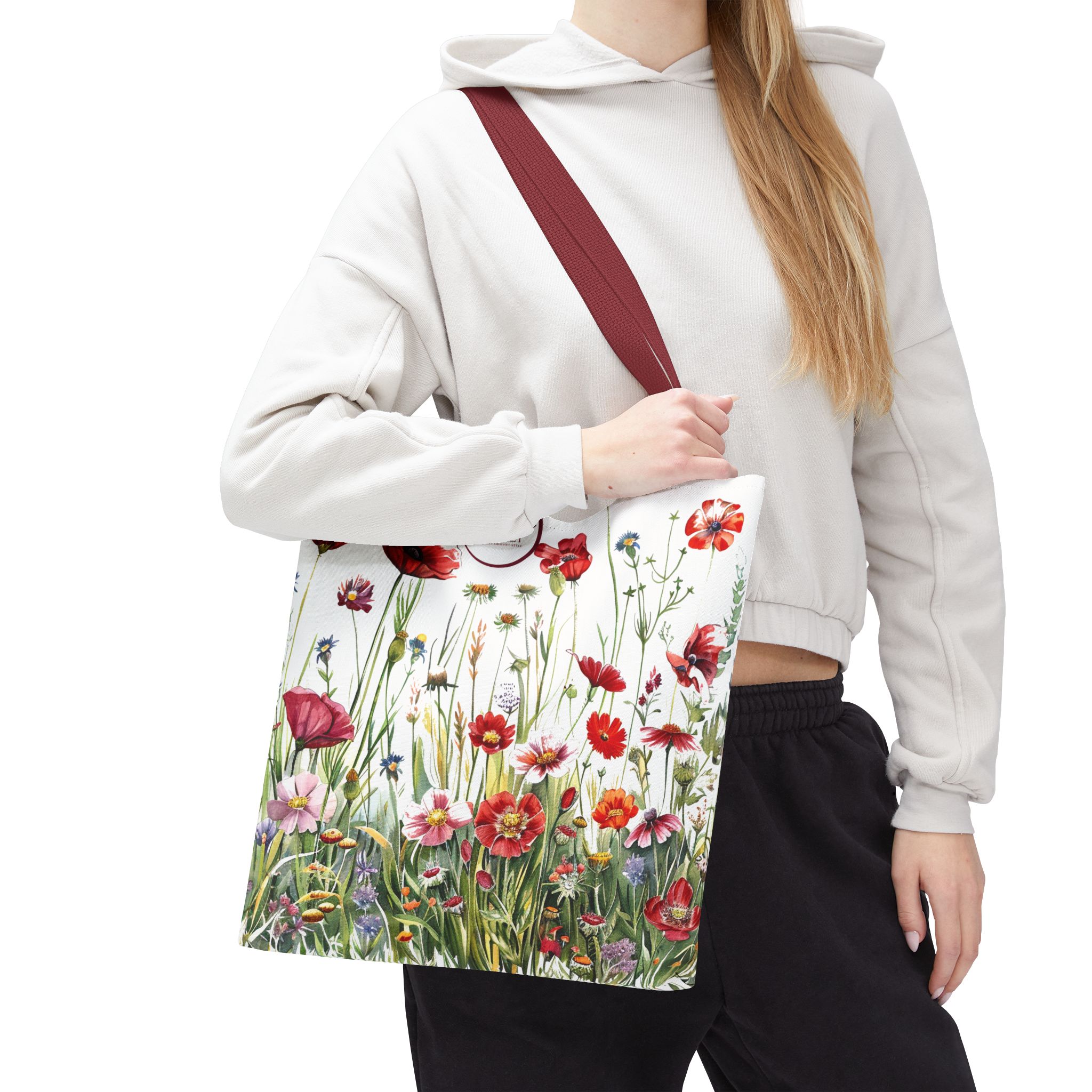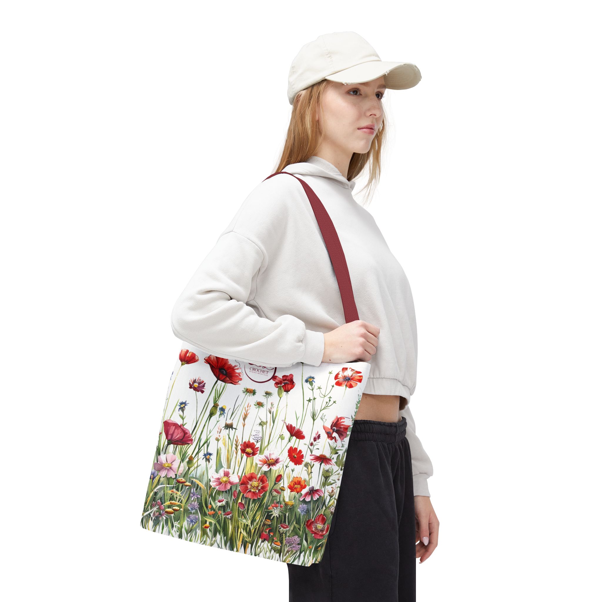 Introducing the fanciful and colorful Cardinal Red Wildflowers project tote from On The Hook. This tote designed with original wildflower art using multiple shades of red flowers. This one-of-a-kind tote is customized with the On The Hook logo. Roomy 16″ x 16″ is big enough to hold several skeins of yarn and a project WIP. Made with polyester canvas, this bag has double-stitched seams, cotton webbing straps, and nonwoven laminate lining for easy use and durability. Perfect as a personal tote or as a thoughtful gift for someone you care about.