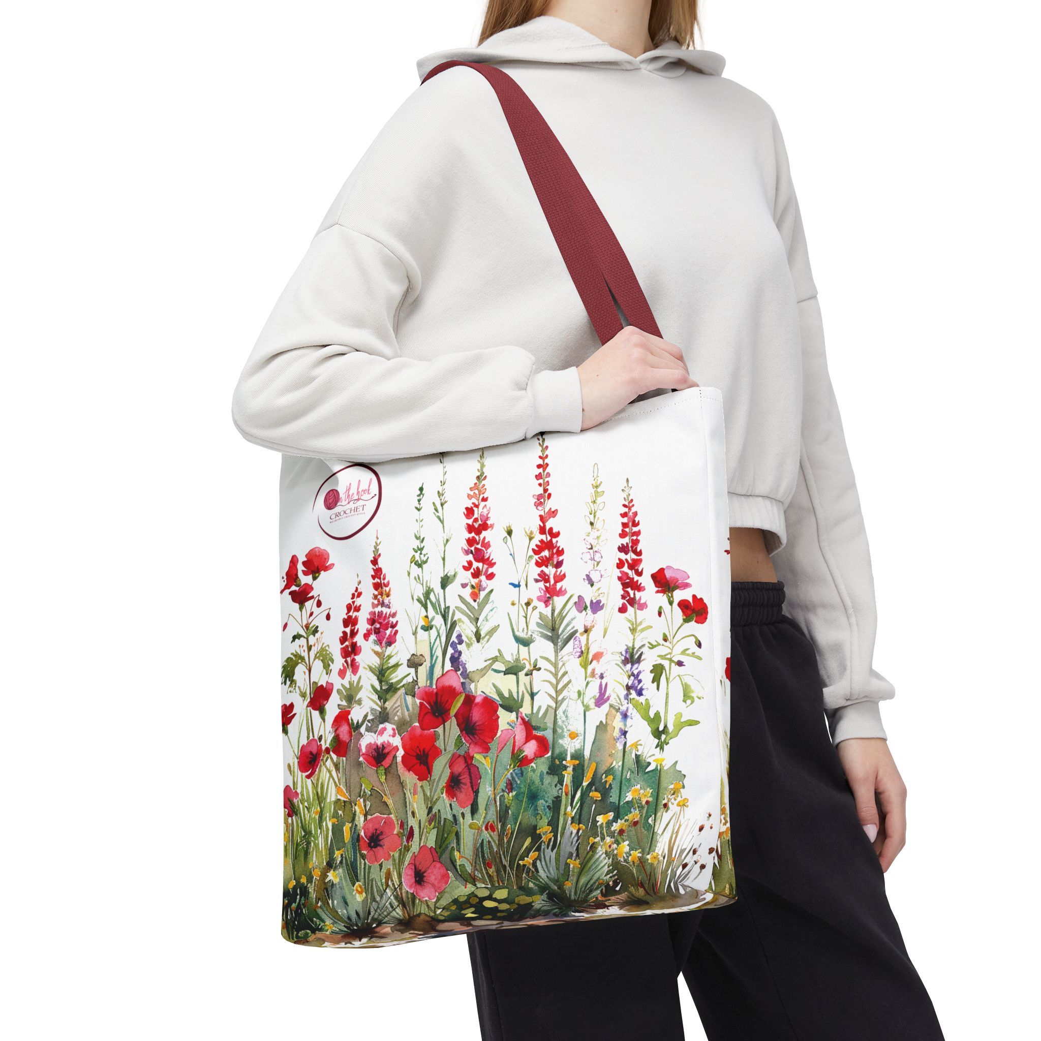 Introducing the stunning Cardinal Red project tote bag from On The Hook Crochet. This wildflower tote is designed with original art with red accents and coordinated red straps. This one-of-a-kind tote is customized with the On The Hook logo. Roomy 18″ x 18″ is big enough to hold several skeins of yarn and a project WIP. Made with polyester canvas, this bag has double-stitched seams, cotton webbing straps, and nonwoven laminate lining for easy use and durability.