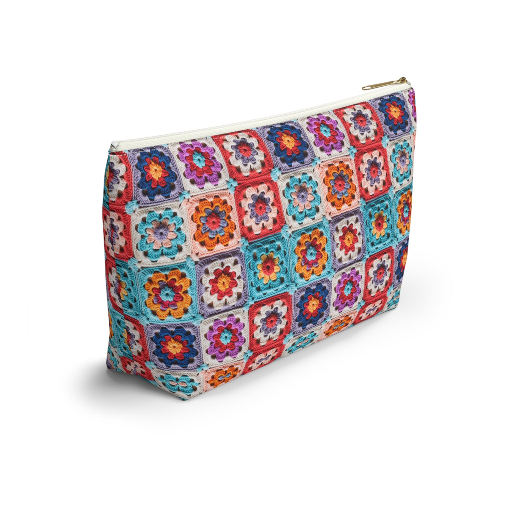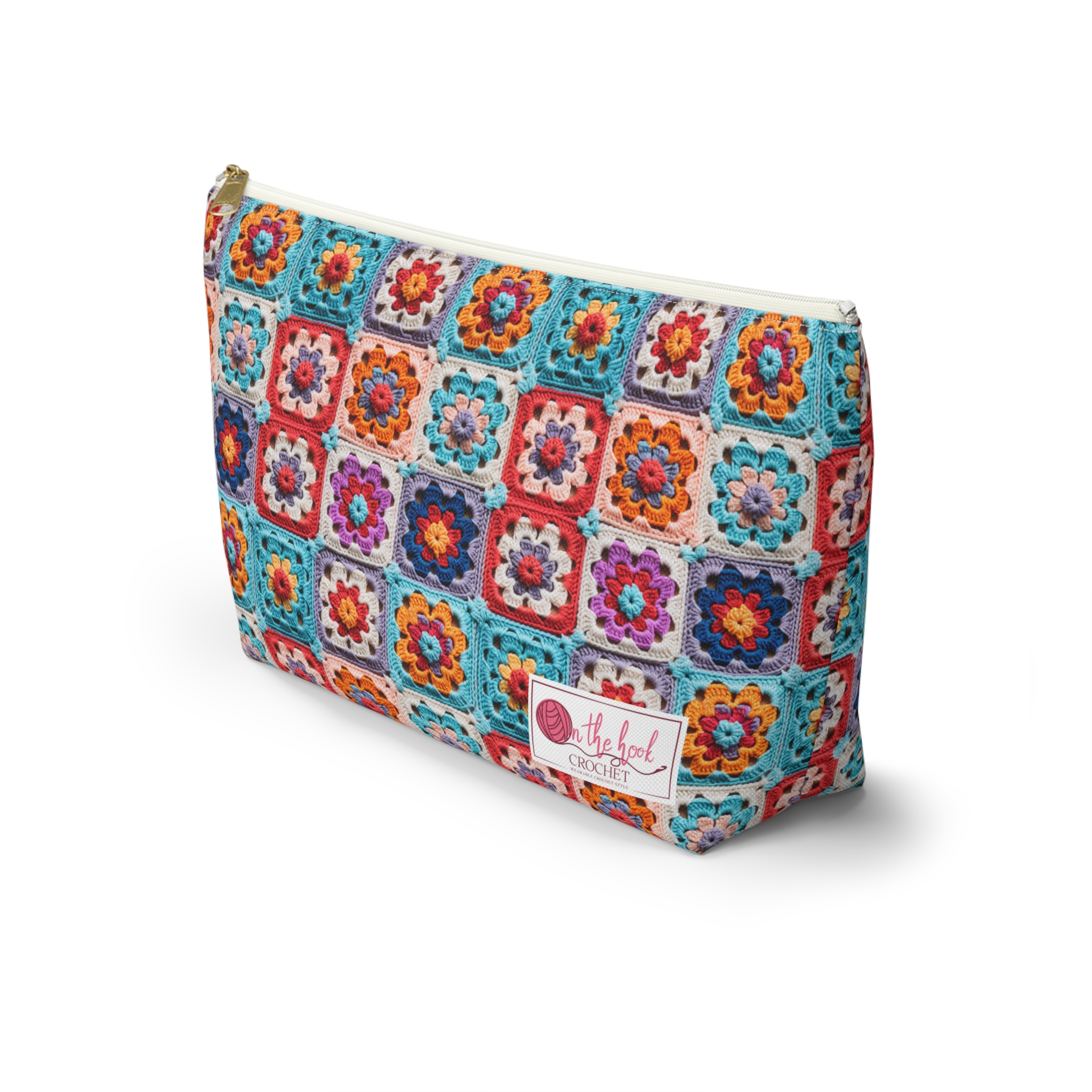 The colorful new GRANNY SQUARES Project Pouch is perfect for starting a new crochet project. I love getting started with a pouch this size to hold my first skein, my hook and my instructions. As my project grows, I move to a larger bag, and then this pouch is ready for another project! Long lasting polyester canvas material, smooth lining and a YKK zipper closure.