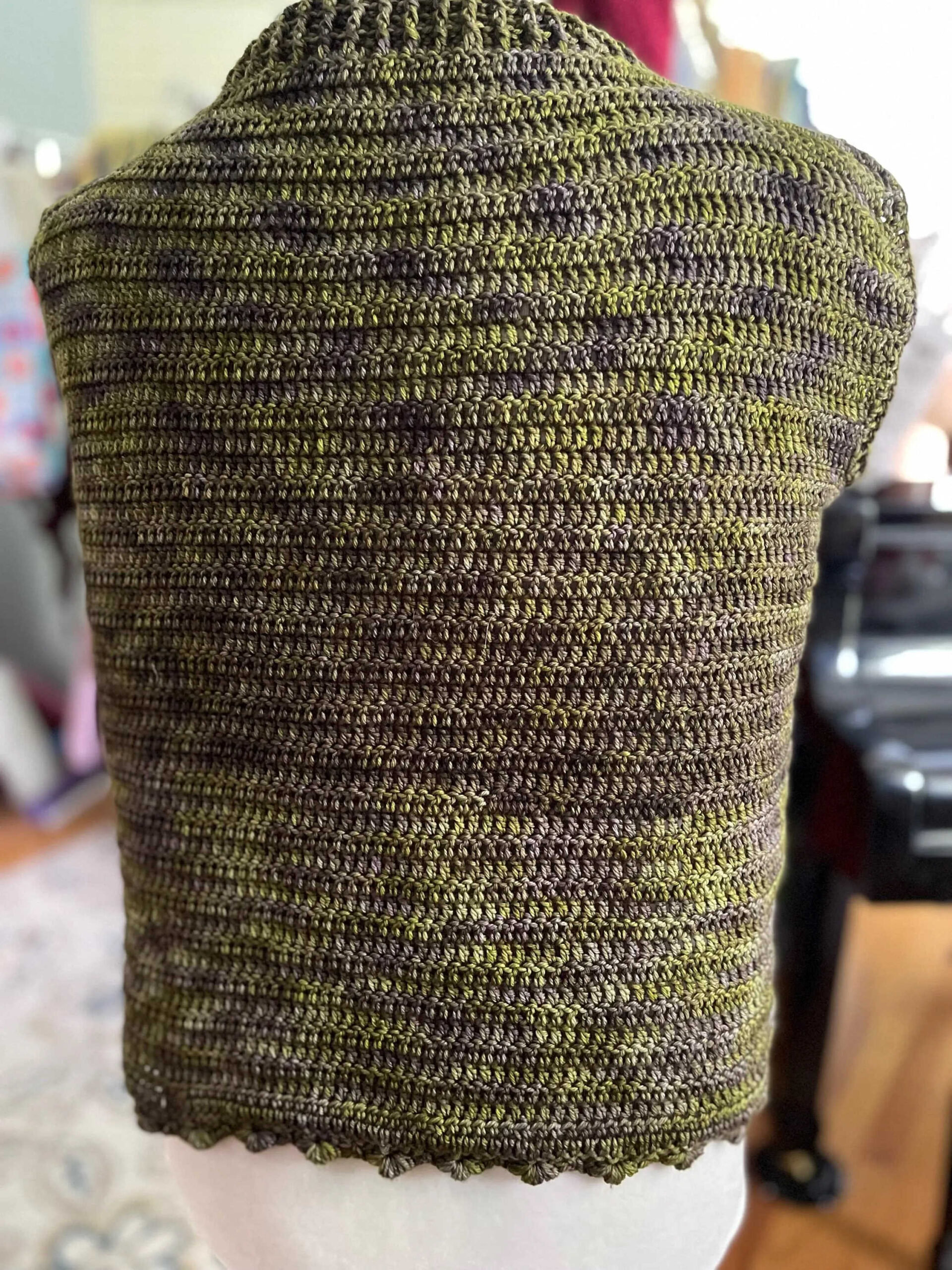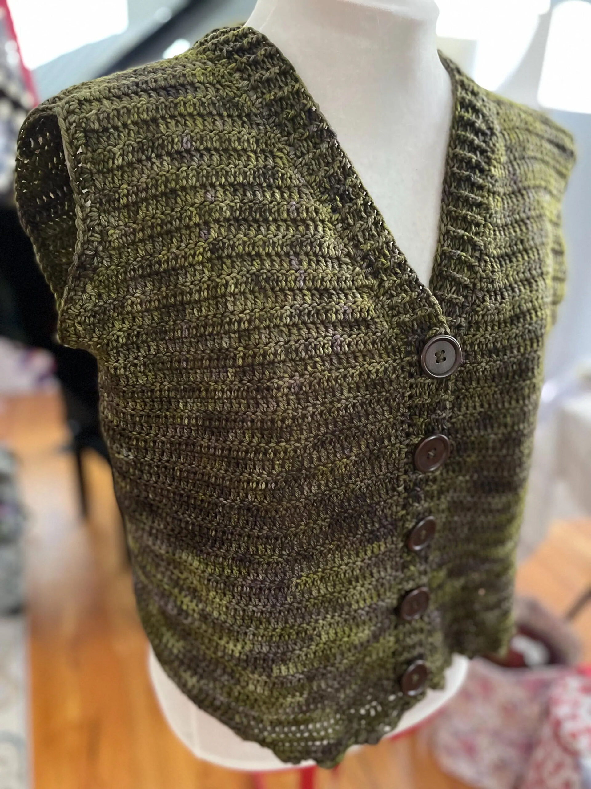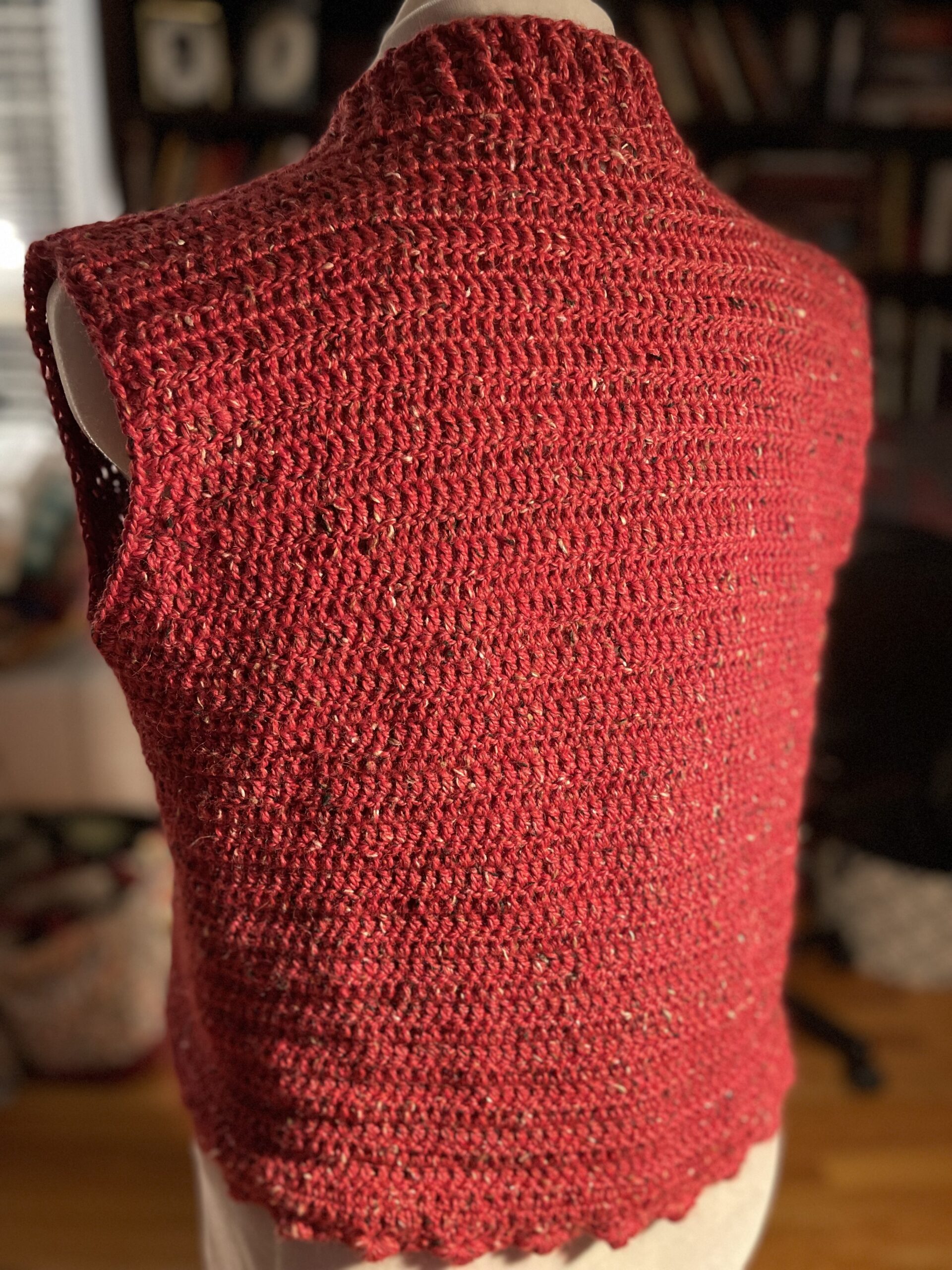 Treat yourself to a versatile vest that slips over your head – or crochet yours with buttonholes and buttons to wear open if you want. Three versions of this vest give you multiple designs to work your vest just the way you want. This vest is an easy crochet project in any yarn you please. One option is to crochet your vest with ties in the front. A second version is a pullover style with buttons holding the fronts together, for the pullover style. Another pullover style is to have a button closure, using buttonholes.