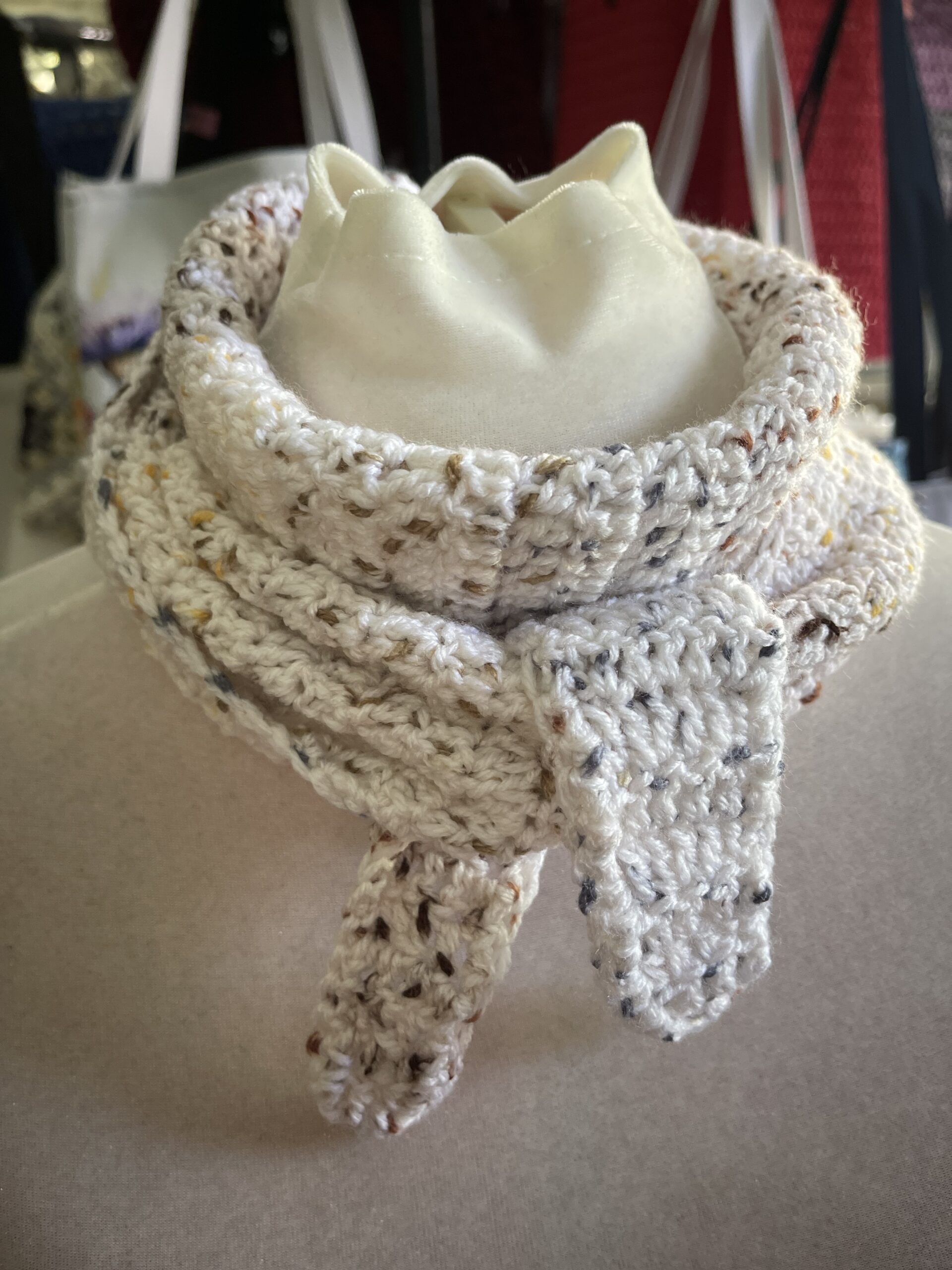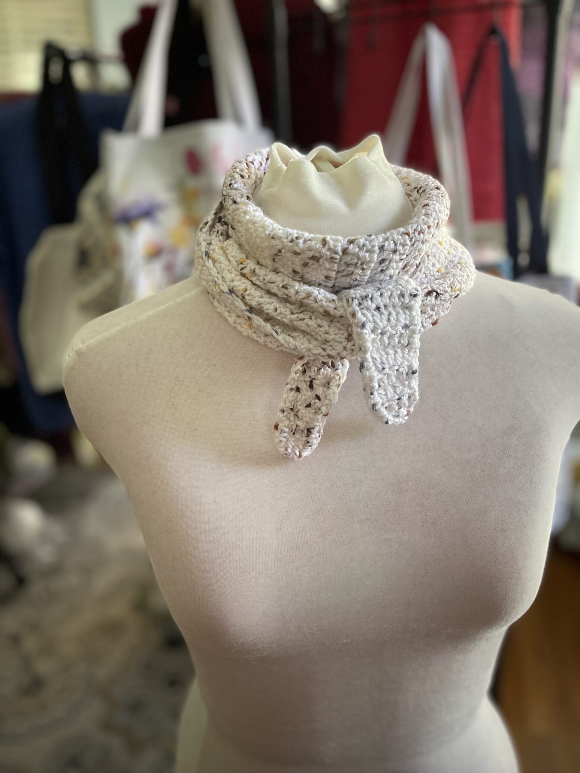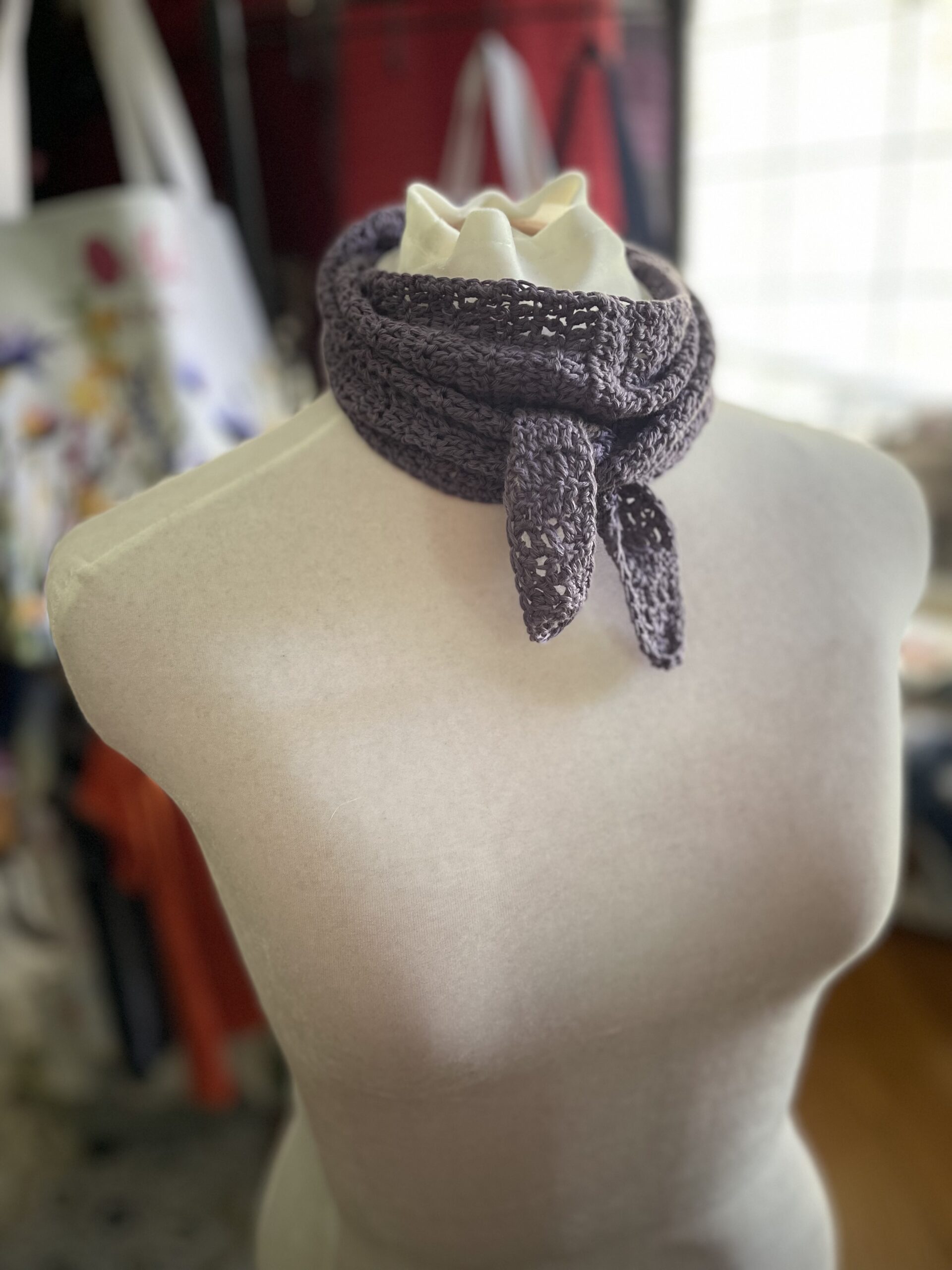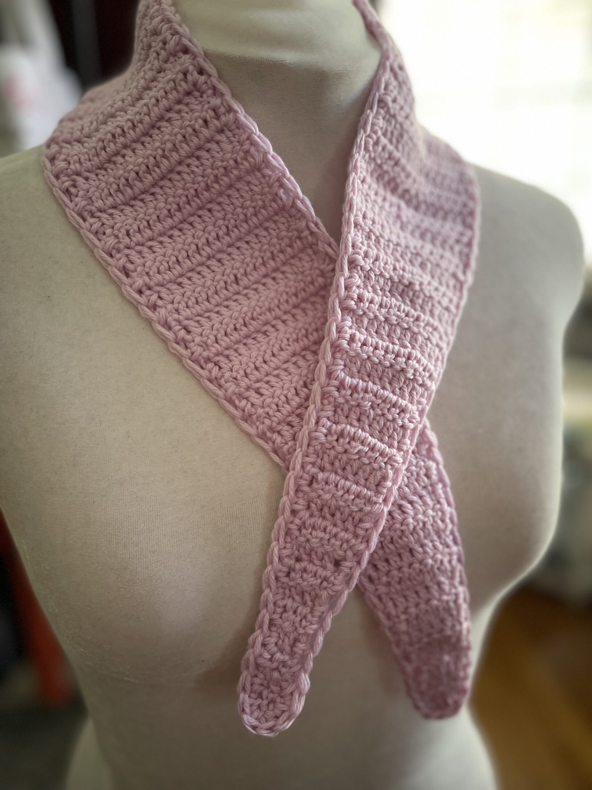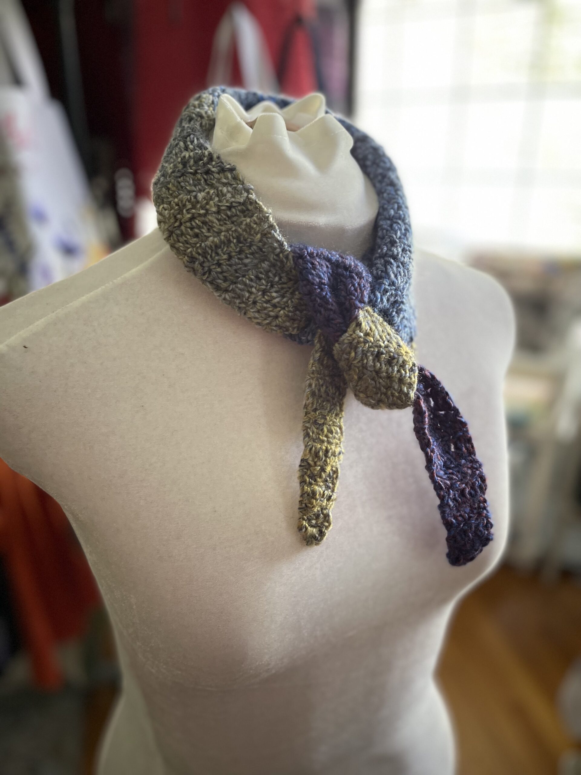 Last year, the fiber world was obsessed with knitting a ‘Sophie Scarf’, an easy to knit quick accessory that looks good with just about any top, sweater, coat, vest, shirt, tank top – basically anything in your wardrobe. There are a ton of videos showing how to style the scarf – so I was inspired to design a scarf that is a quick crochet, instead of knit.