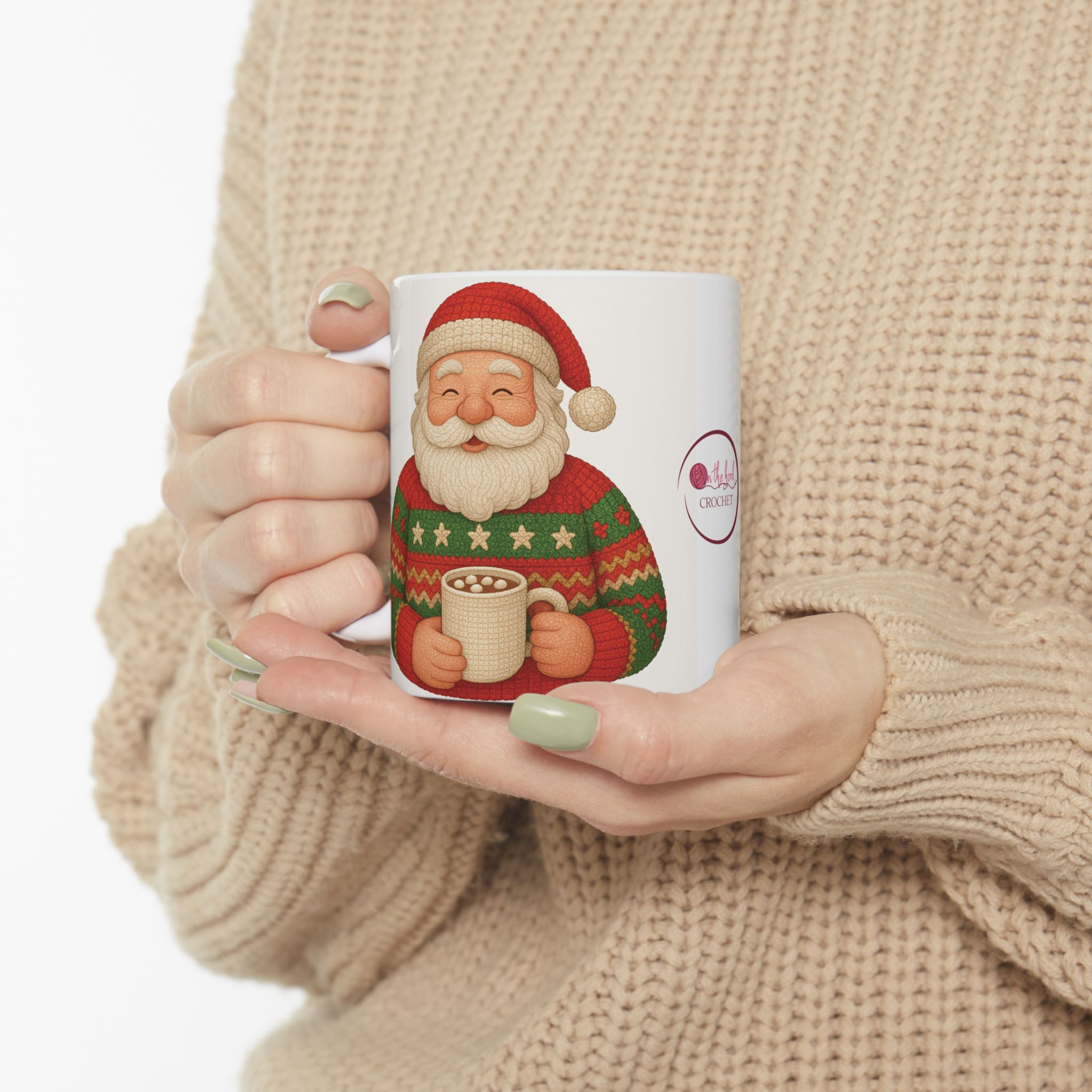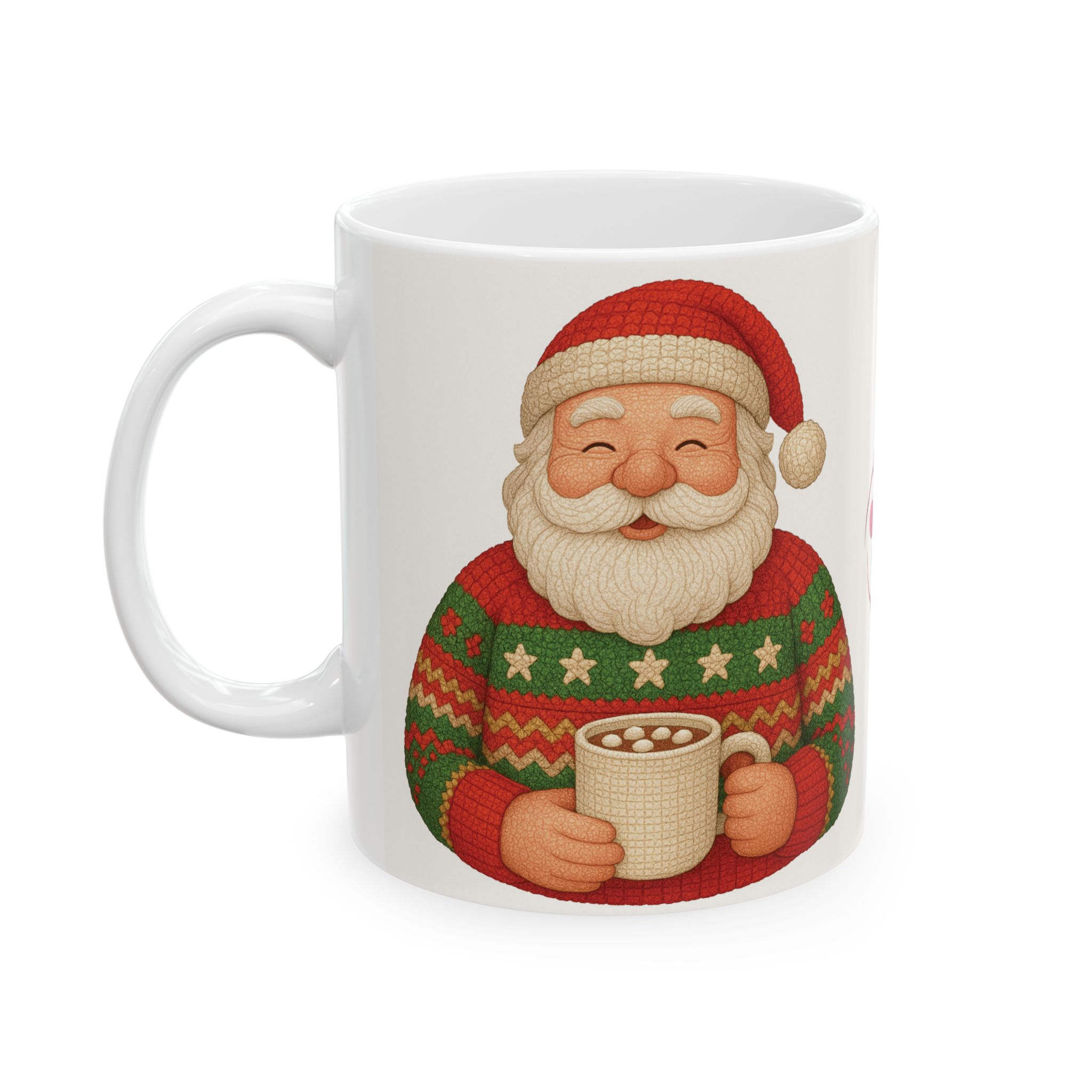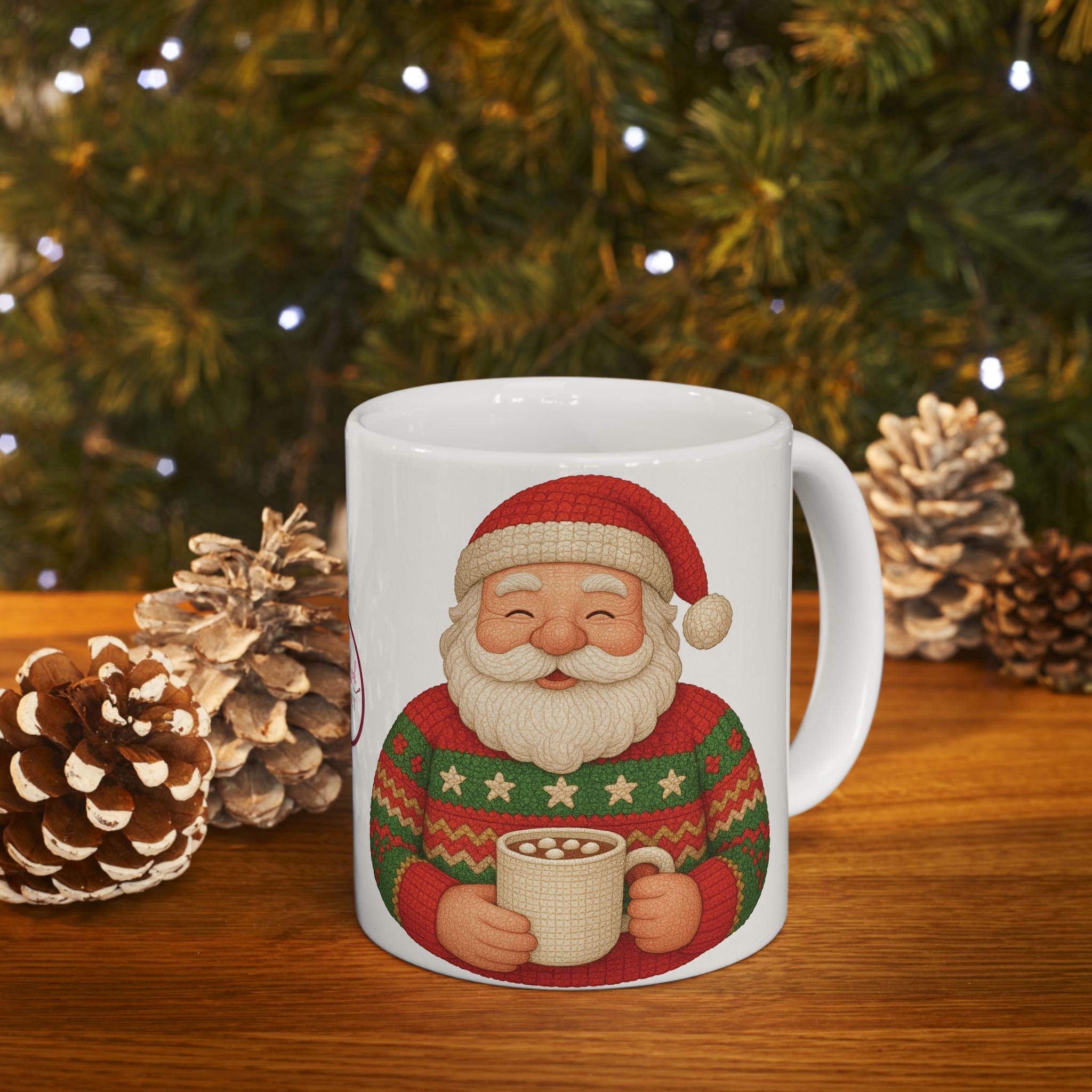 Santa, decked out in his handmade Christmas crochet seater and cap, enjoys a cup of hot cocoa. This ceramic mug brings that cozy, slightly mischievous scene to your kitchen—bright, cheery colors that pop against glossy white. It’s the kind of mug you reach for on a frosty morning or during a late-night wrapping session, the one that adds a little holiday warmth to everyday routines. Comfortable to hold, easy to care for, and safely built for daily use, it fits naturally into seasonal movie nights, cookie-baking afternoons, or a pause between errands when you want a small, familiar comfort.