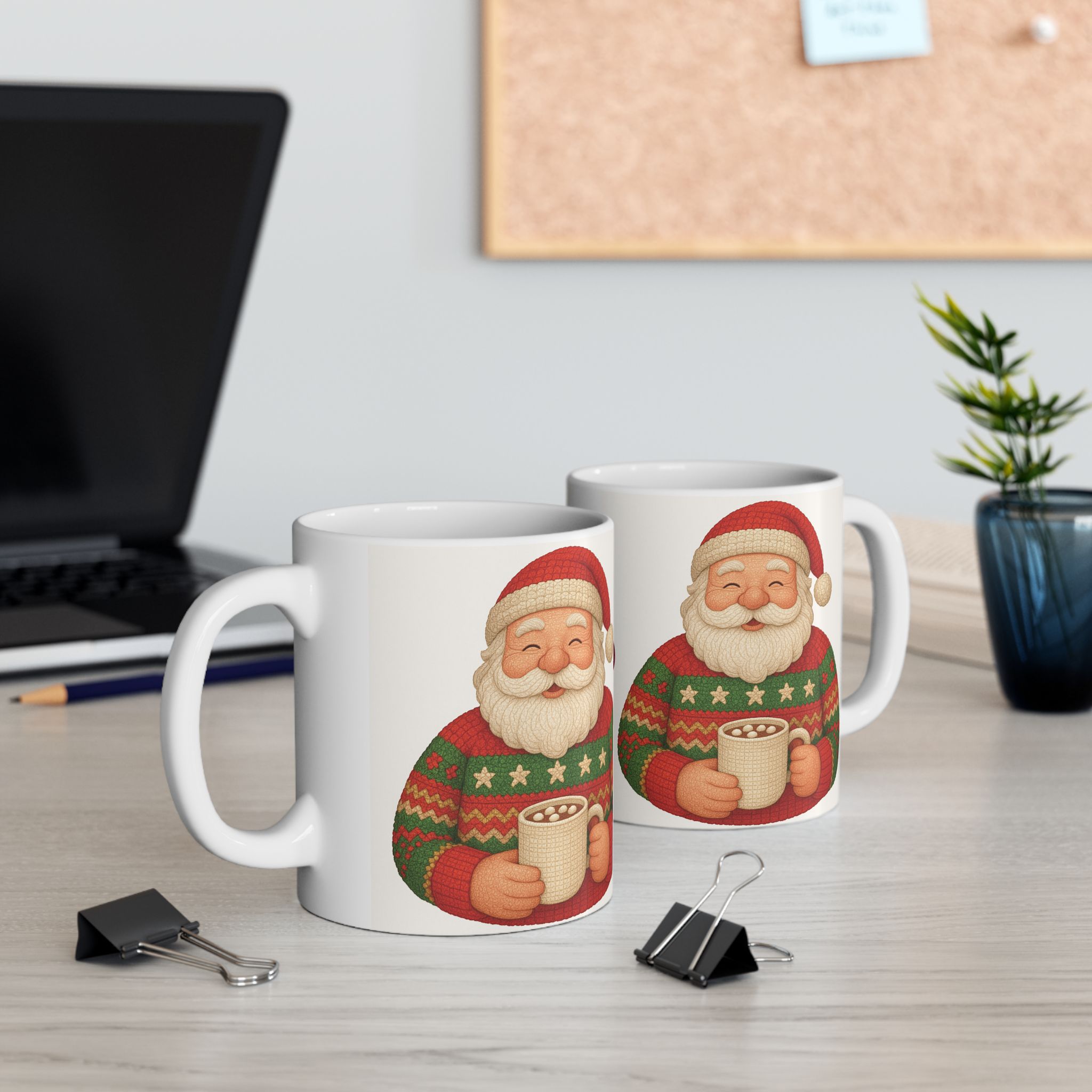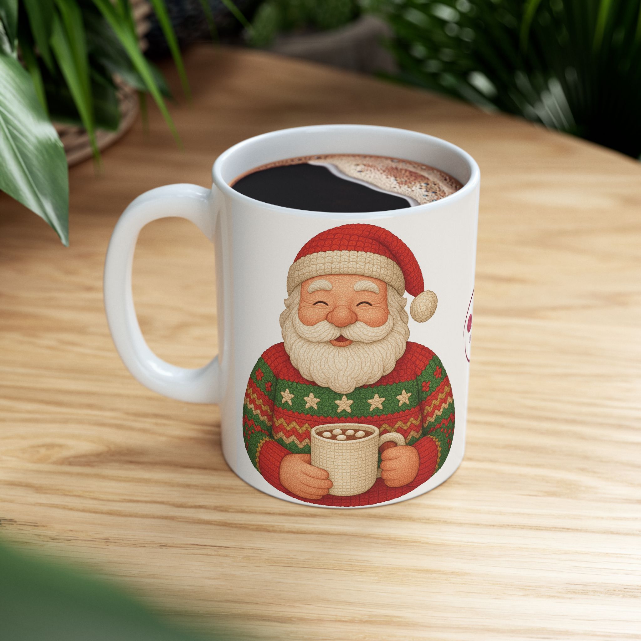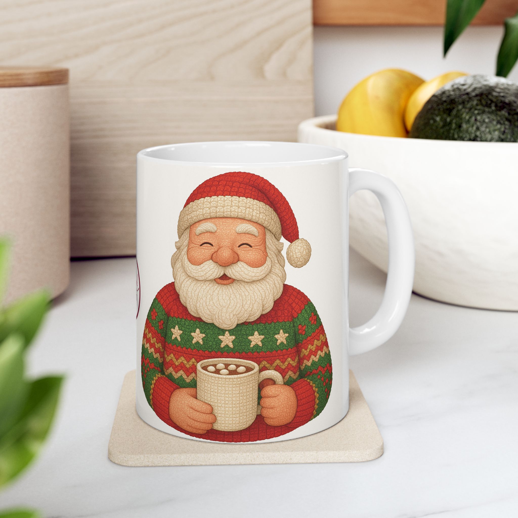 Santa, decked out in his handmade Christmas crochet seater and cap, enjoys a cup of hot cocoa. This ceramic mug brings that cozy, slightly mischievous scene to your kitchen—bright, cheery colors that pop against glossy white. It’s the kind of mug you reach for on a frosty morning or during a late-night wrapping session, the one that adds a little holiday warmth to everyday routines. Comfortable to hold, easy to care for, and safely built for daily use, it fits naturally into seasonal movie nights, cookie-baking afternoons, or a pause between errands when you want a small, familiar comfort.