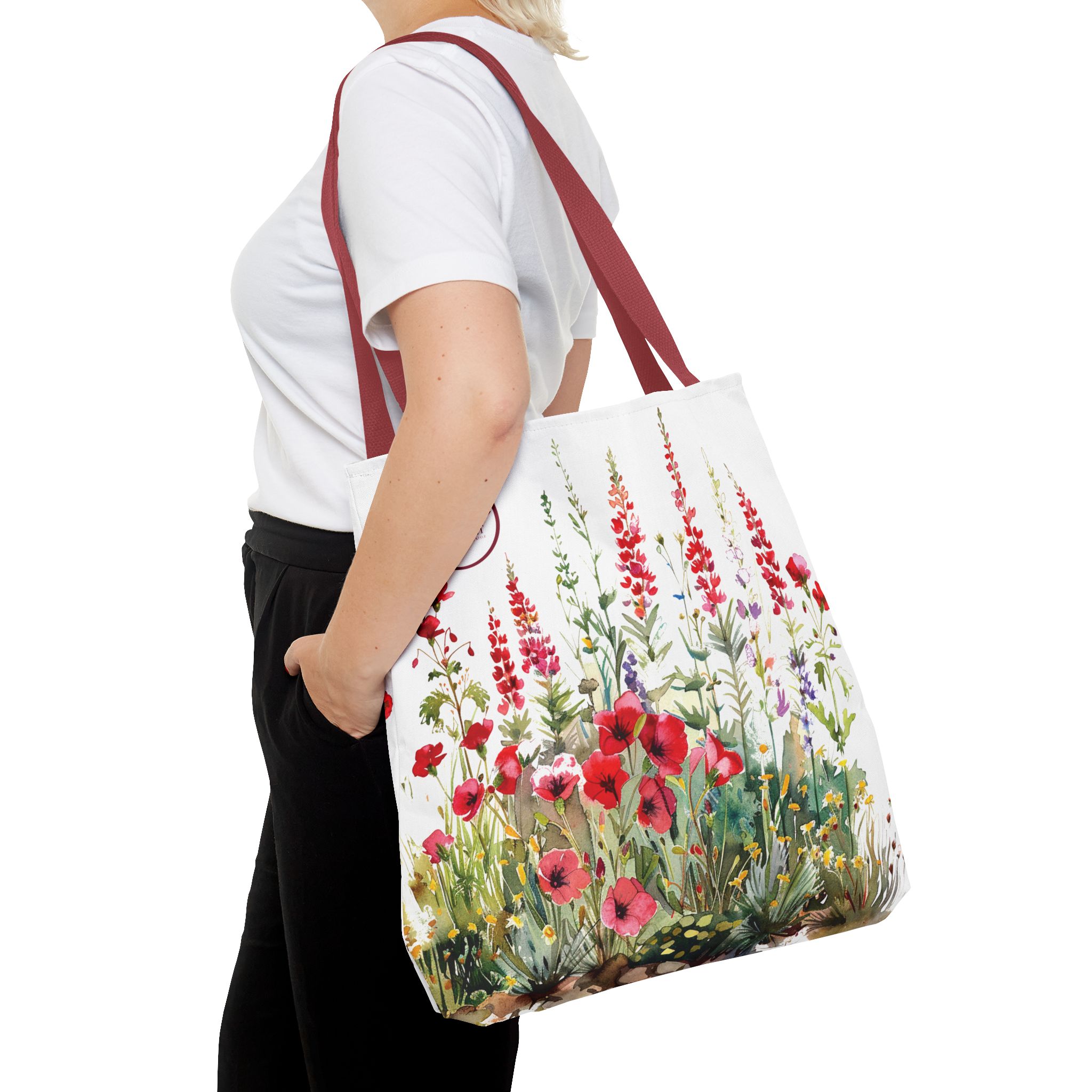 • Cardinal Red Wildflowers Tote – 18′ x 18″