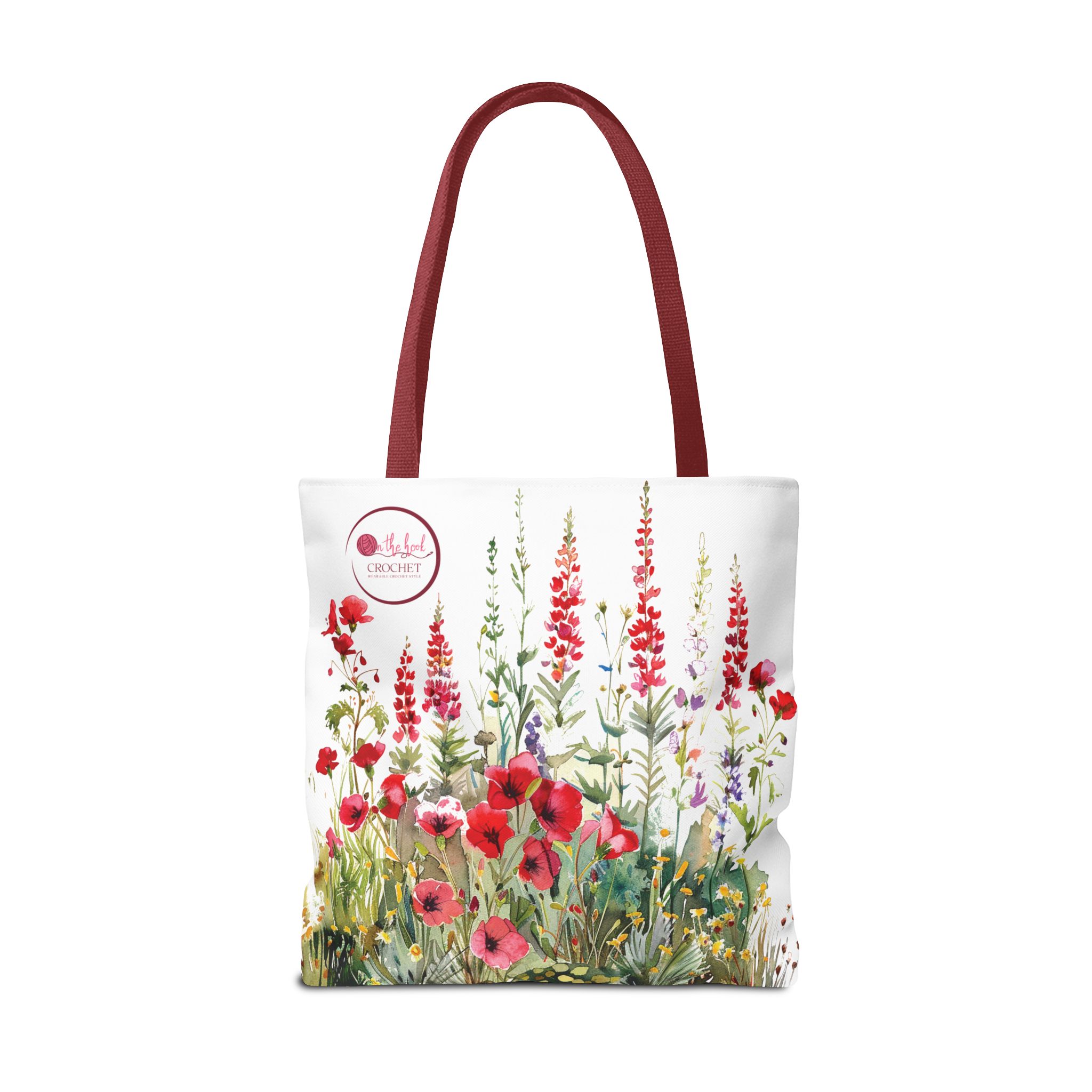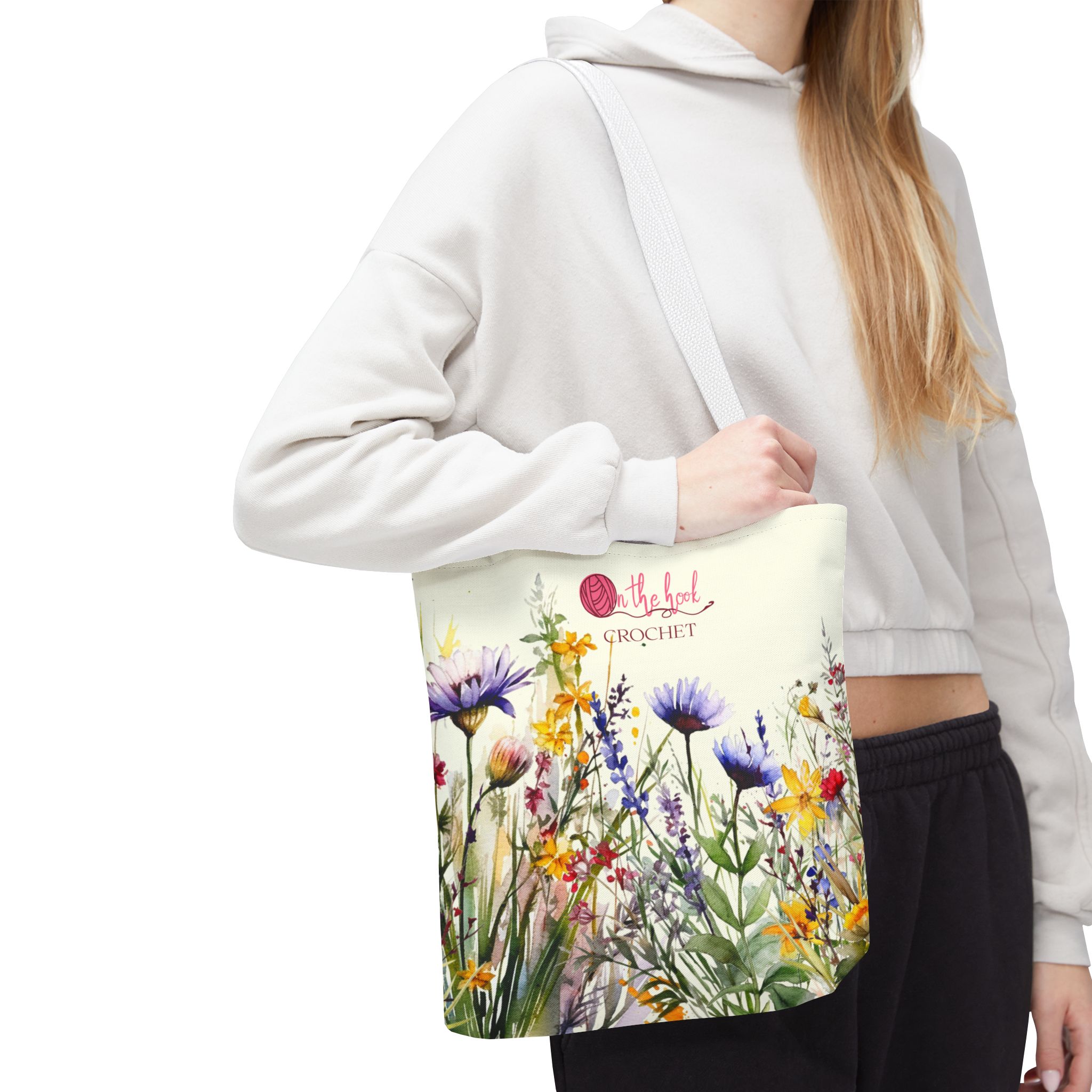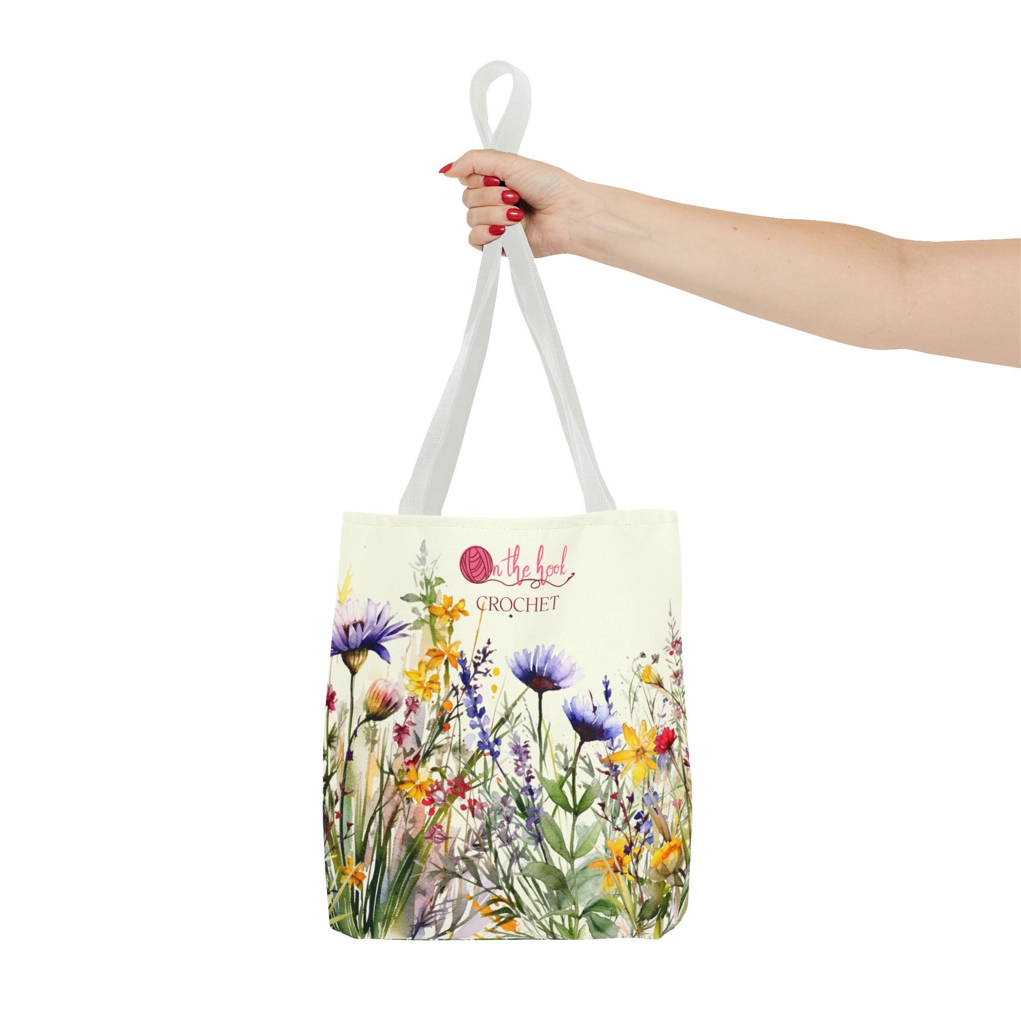 Introducing the stunning Wildflowers project tote bag from On The Hook. This wildflower tote designed with original art is lovely to look at and reminds of springtime. This one-of-a-kind tote is customized with the On The Hook logo. Convenient 13″ x 13″ is just the right size to hold a starter project and a WIP.  Made with polyester canvas, this bag has double-stitched seams, cotton webbing straps, and nonwoven laminate lining for easy use and durability.